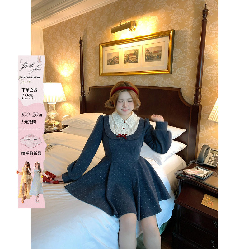 📚 安妮不火 假两件波点印花绑带呢子连衣裙女微胖大码收腰千金风裙