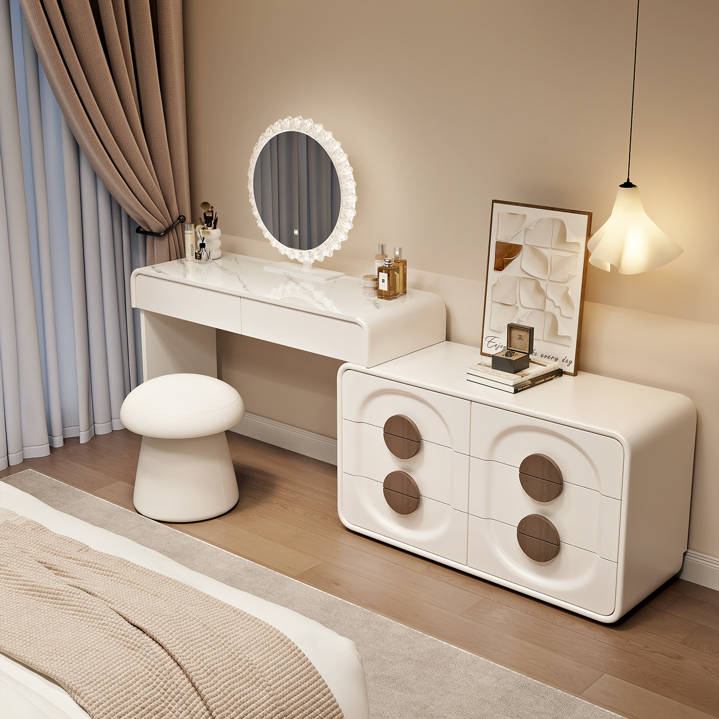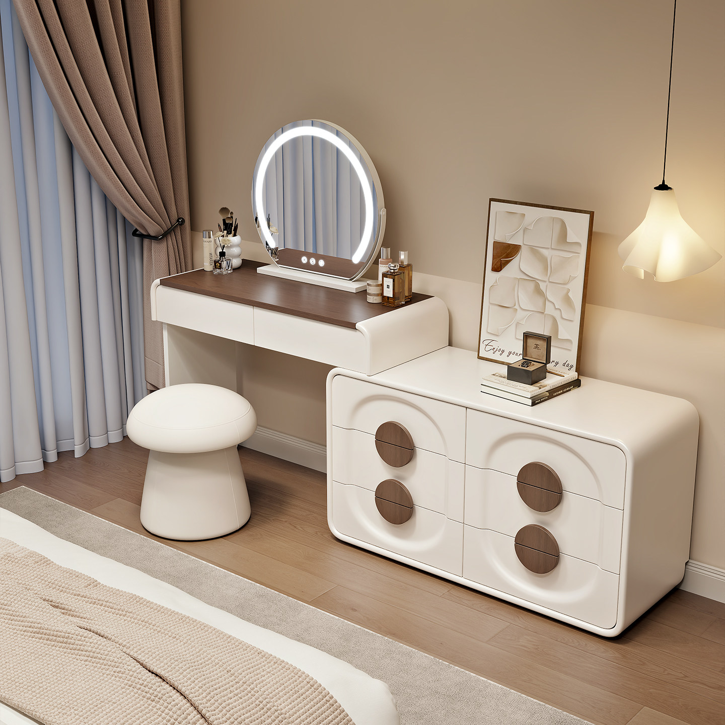 📚 2026新款中古奶油风梳妆台卧室现代简约实木斗柜收纳柜一体化妆桌
