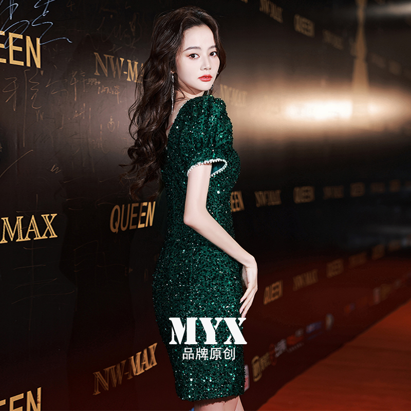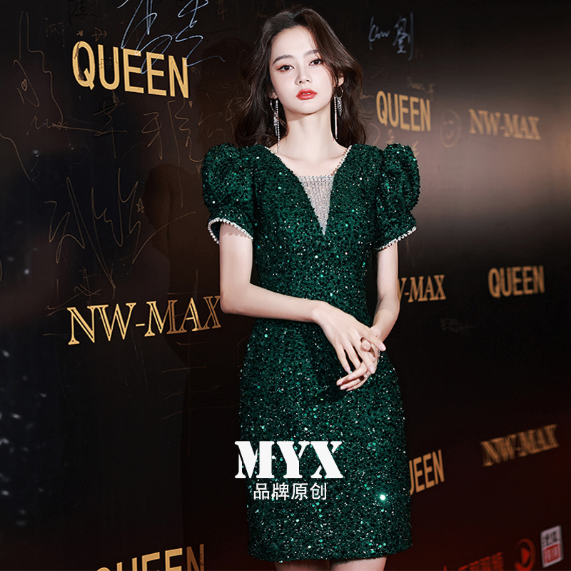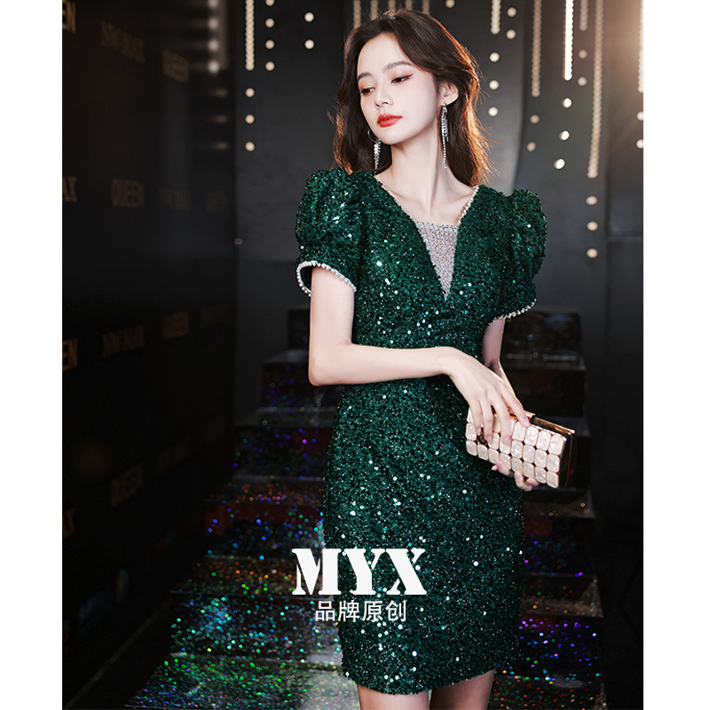 📚 法式小洋装晚礼服女气质名媛高端墨绿色短款亮片轻奢小礼服高级感