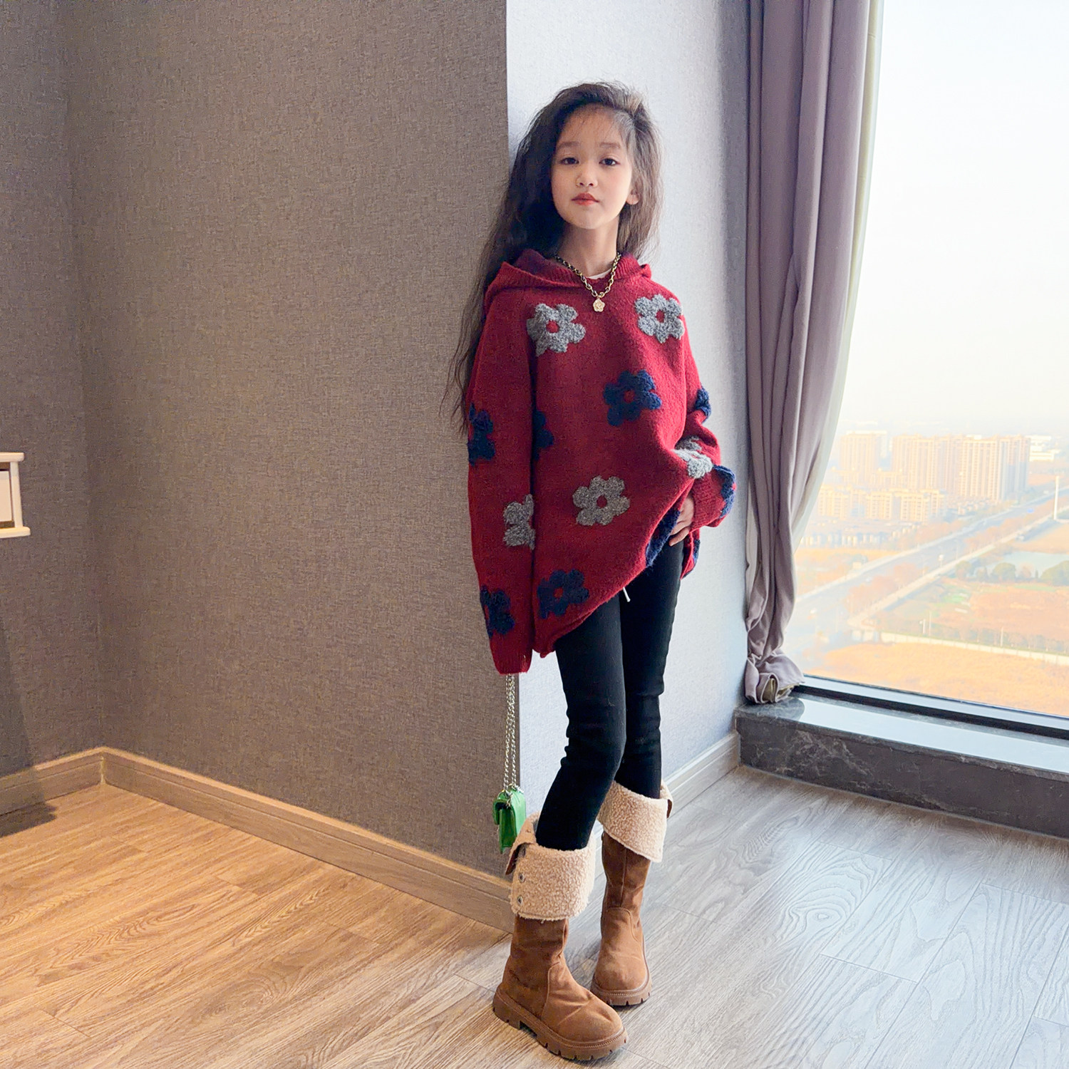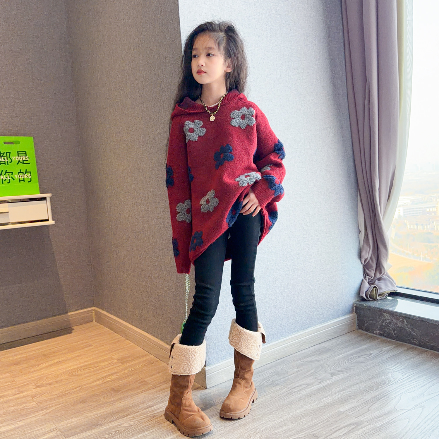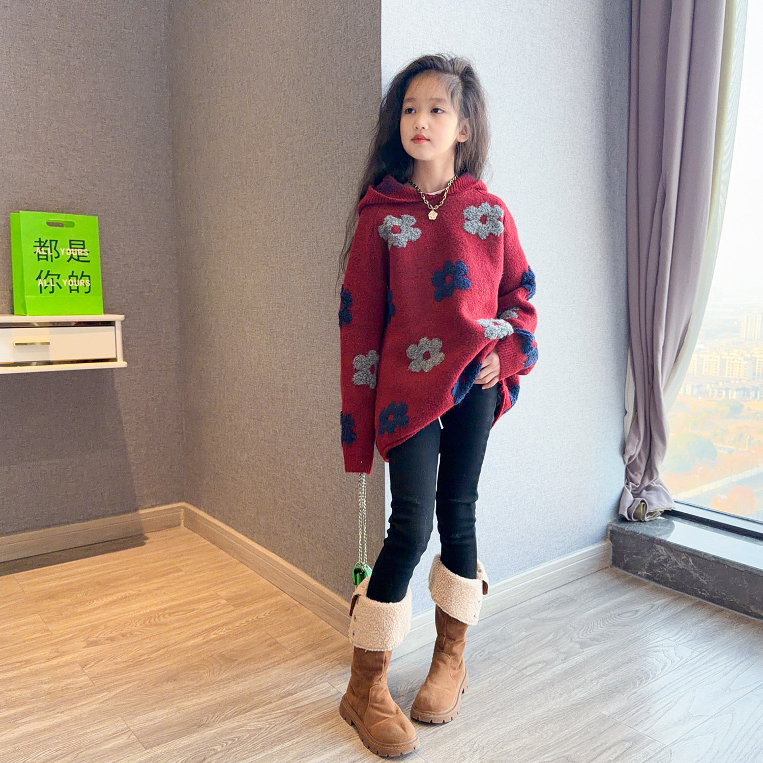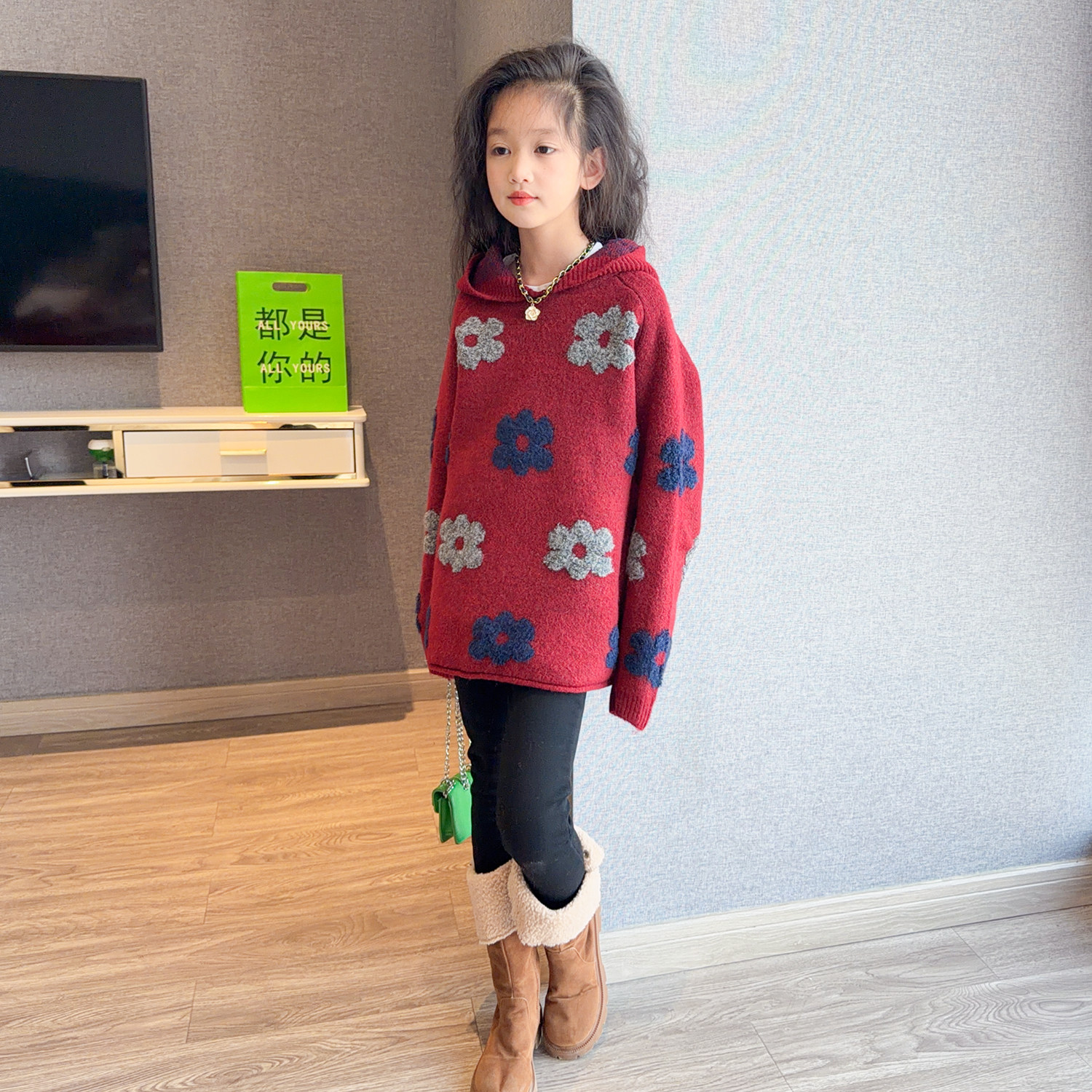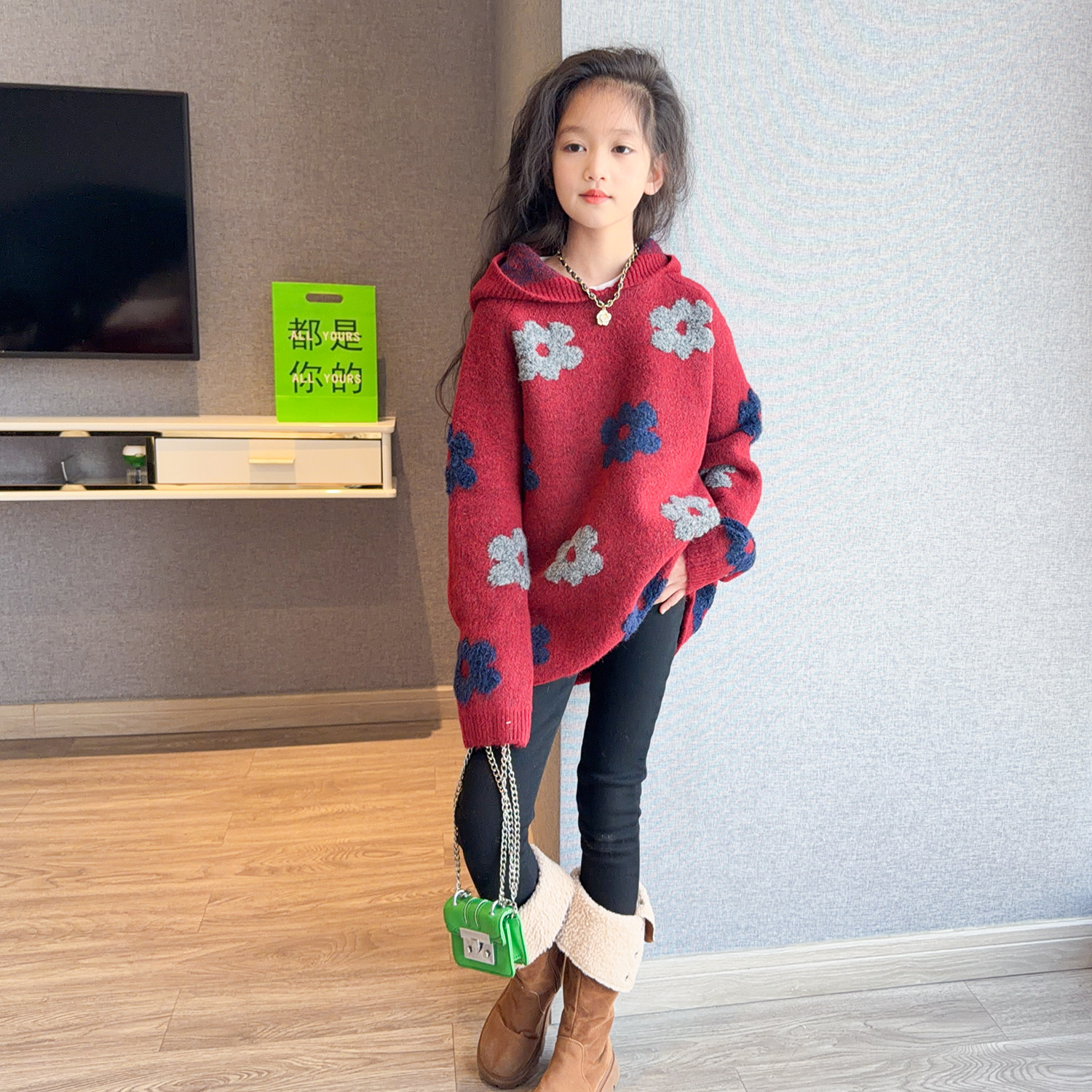 📚 女童红色毛衣加厚2026新款洋气女孩连帽针织衫大童宽松时髦毛线衣