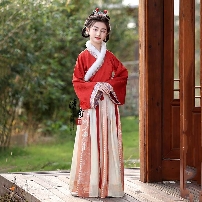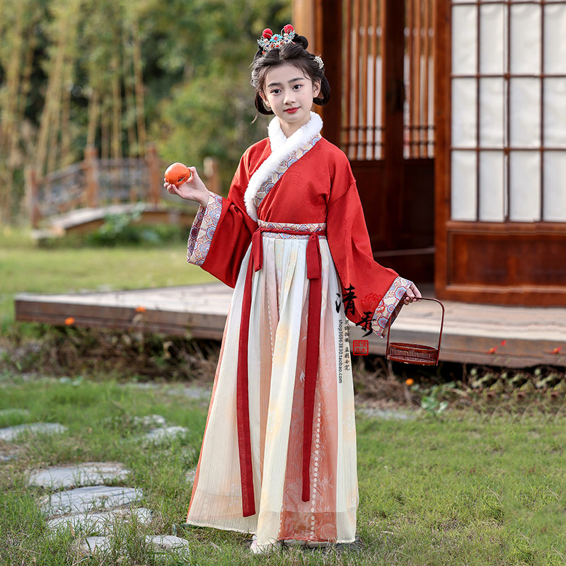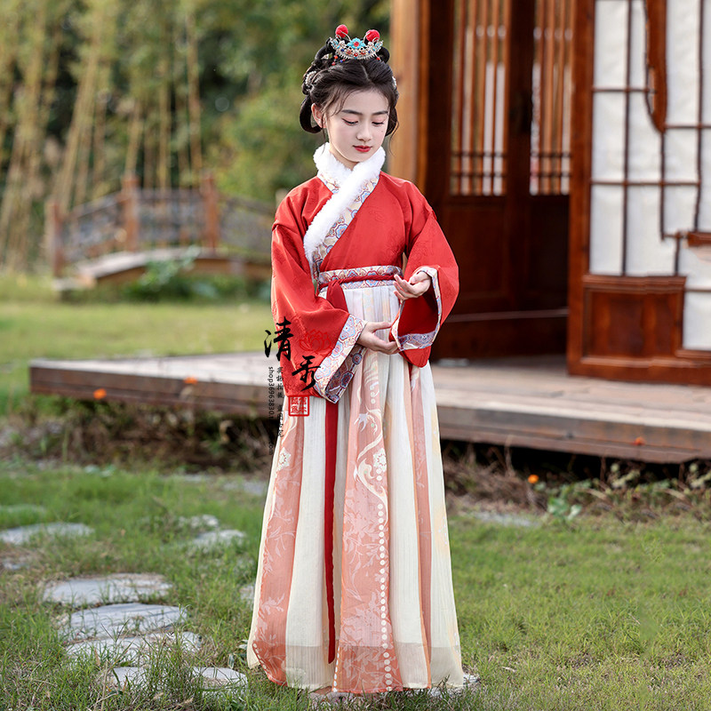 📚 女童汉服唐装拜年服冬季宋制儿童套装喜庆舞台表演古装中国风加绒