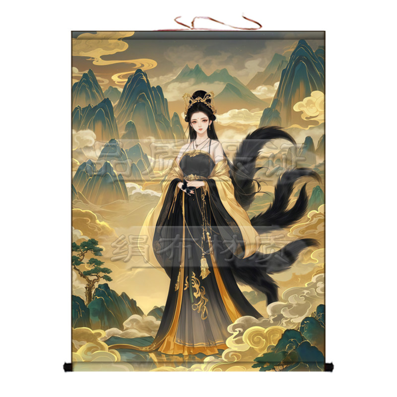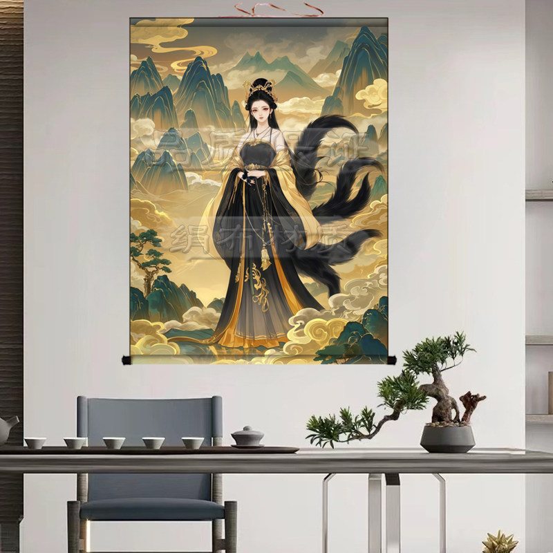 📚 胡家仙九尾狐娘娘挂画女狐卷轴画招财黑狐出马客厅堂口供奉装饰画