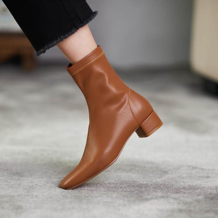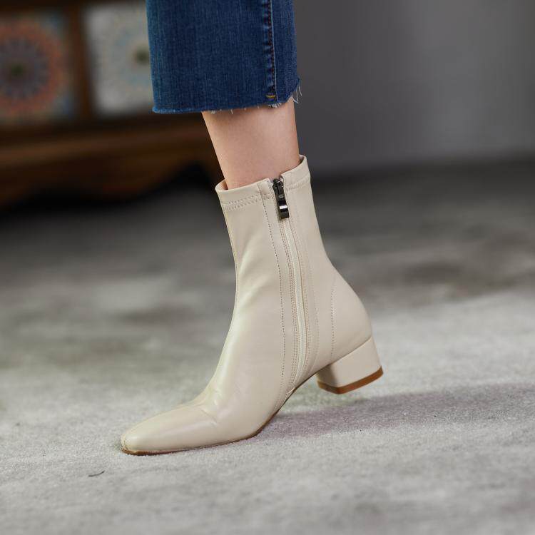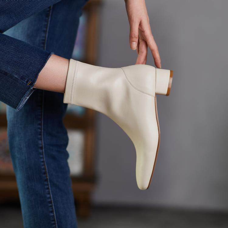 📚 软软软~!巨巨舒服!法式粗跟白色方头短靴女中跟弹力靴瘦瘦靴子
