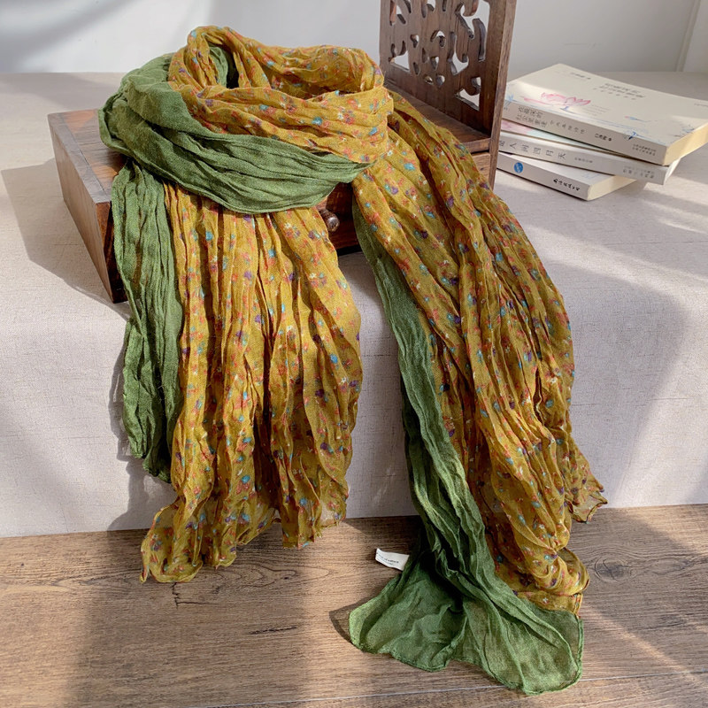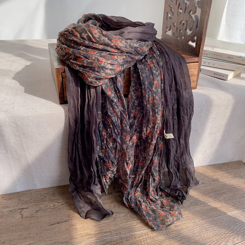 📚 春秋新款褶皱印花棉麻围巾女薄款百搭纱巾复古护颈披肩酒红色围脖