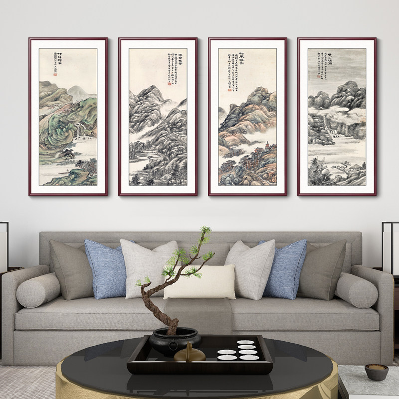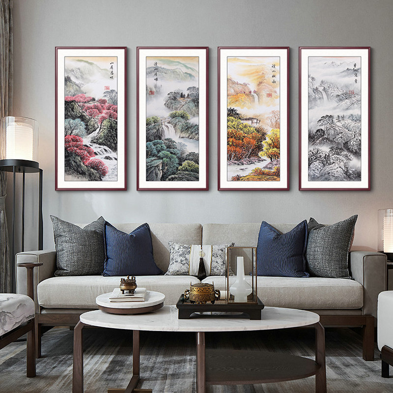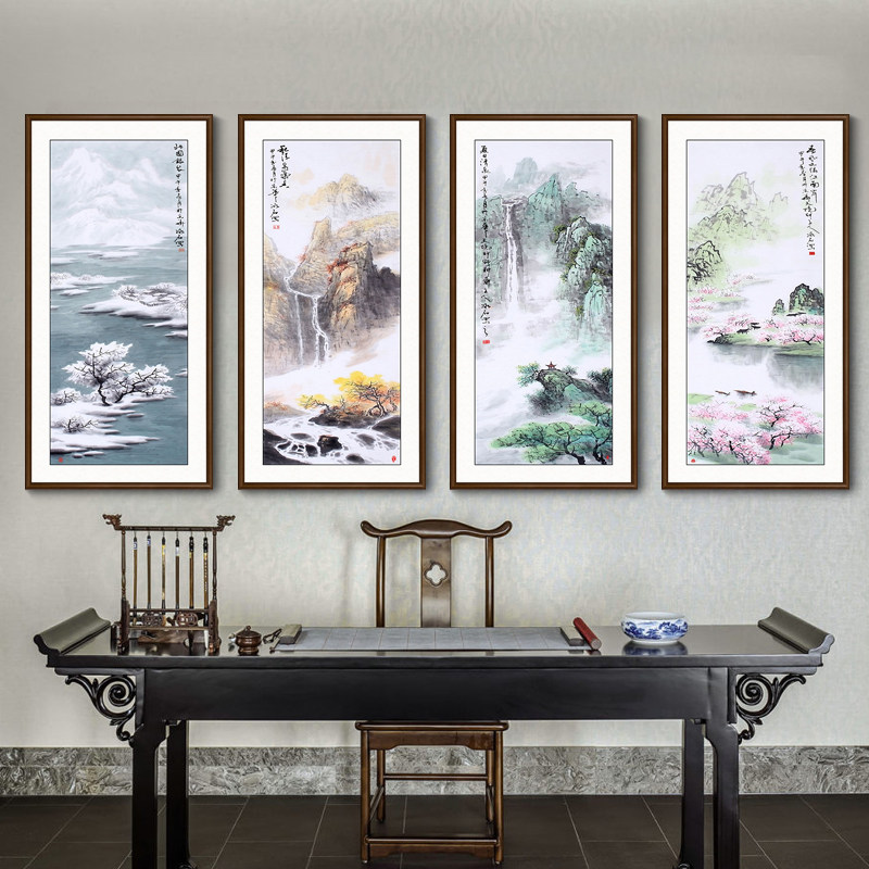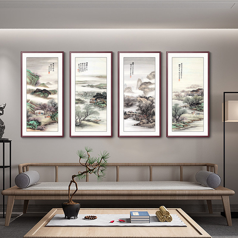 📚 四条屏国画山水画客厅装饰画办公室背景墙挂画新中式春夏秋冬壁画