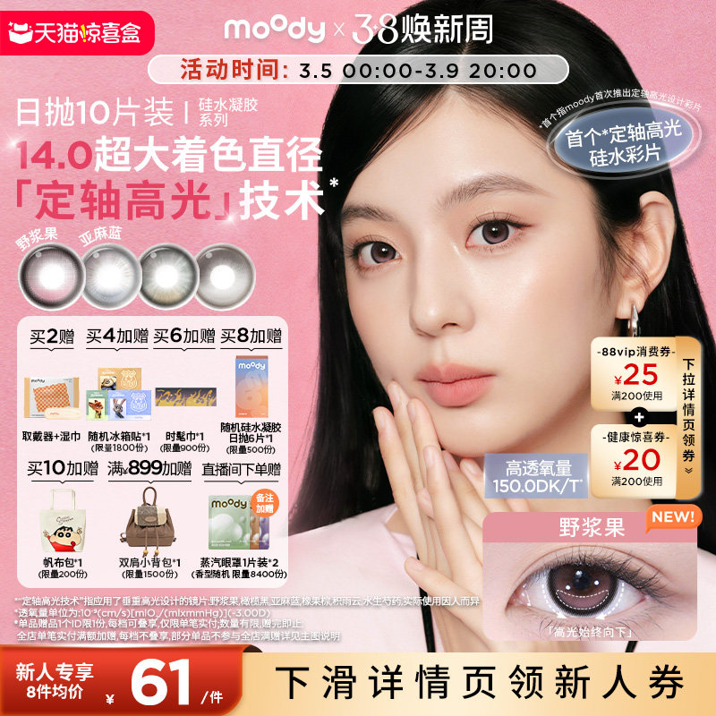 📚 moody硅水凝胶美瞳日抛10片定轴高光亚麻蓝野浆果彩色隐形眼镜