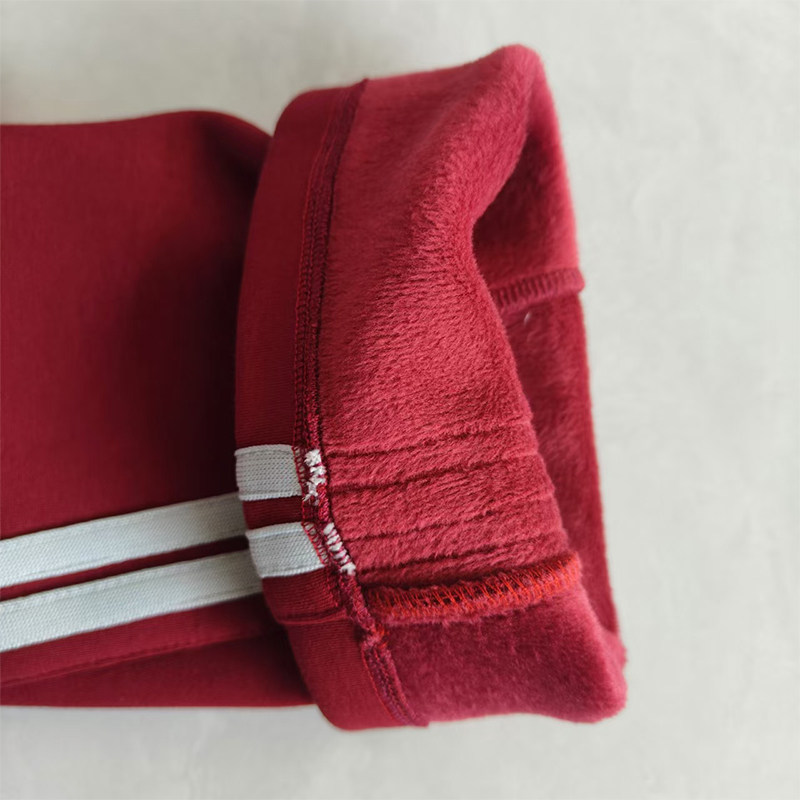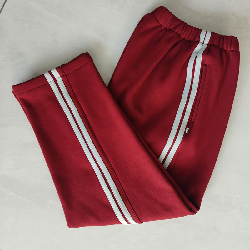 📚 学生校服裤子冬季加绒酒红色拼接两道白条纹加厚纯棉直筒大码长裤