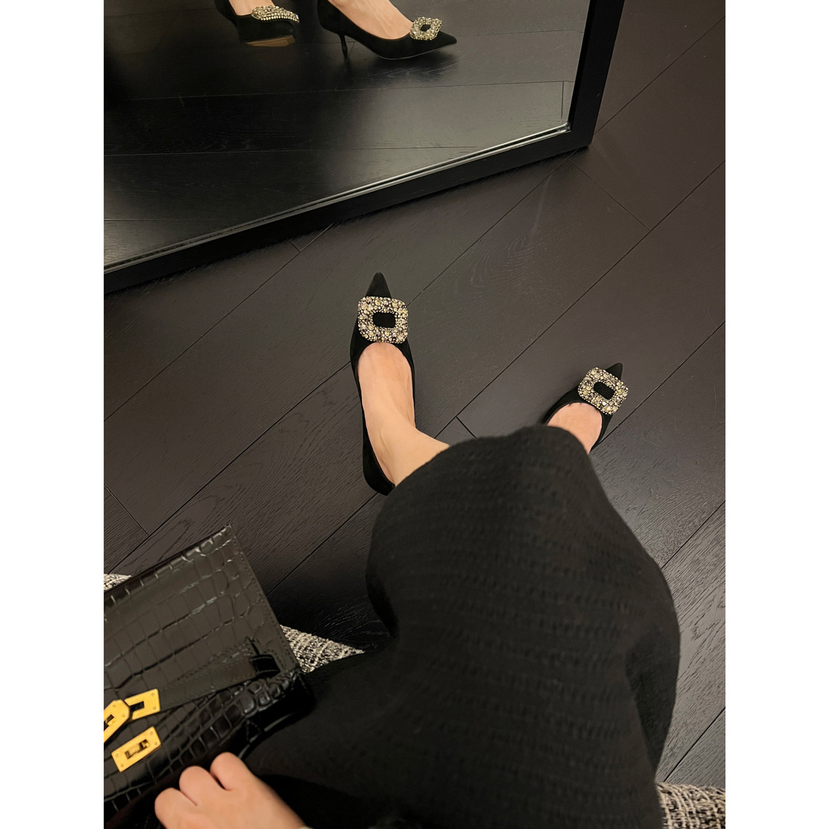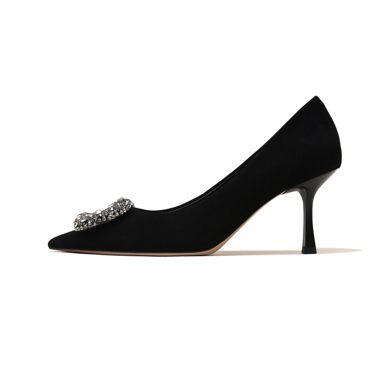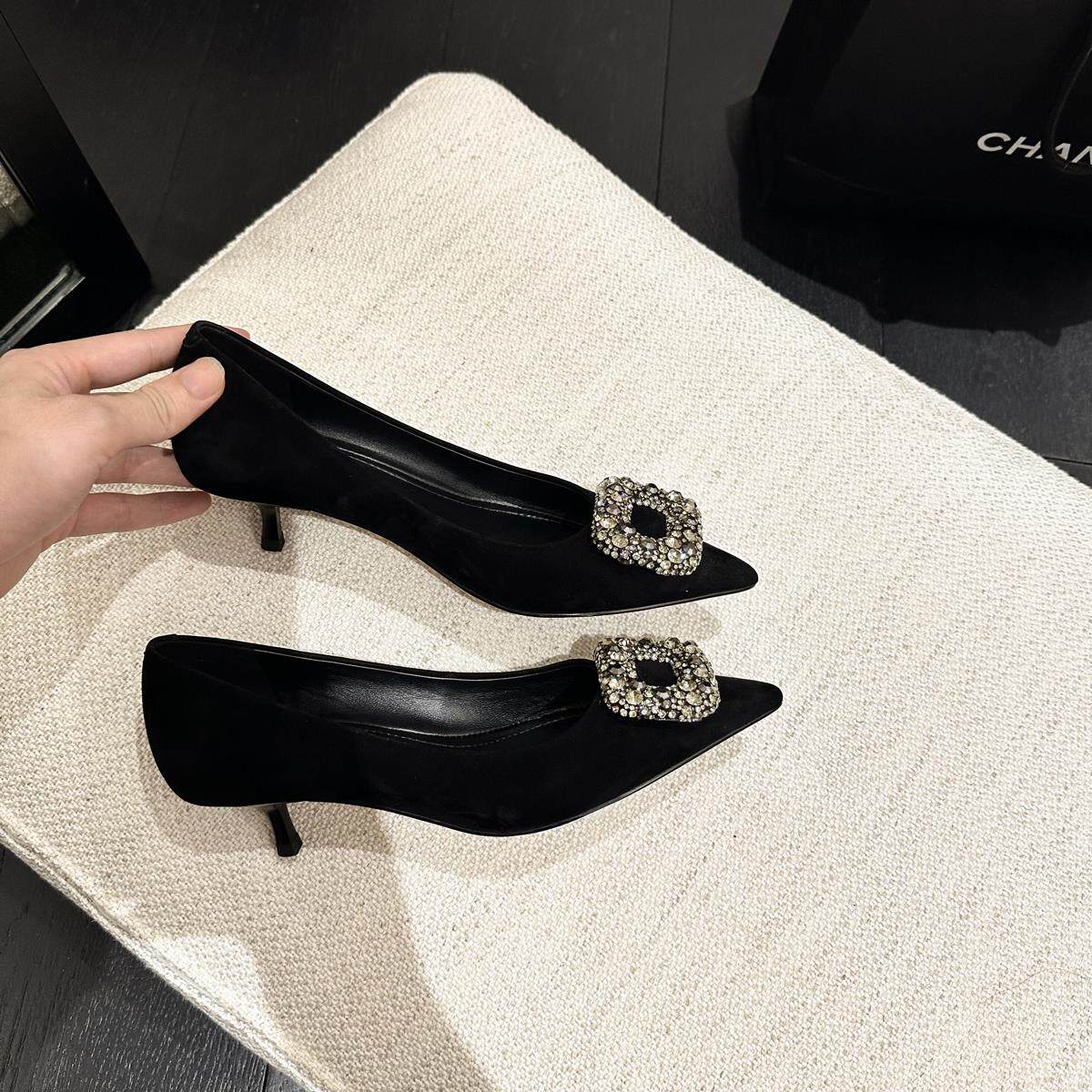 📚 黑色高跟鞋女2025新款尖头羊猄绒水钻方扣百搭细跟软底单鞋配裙子