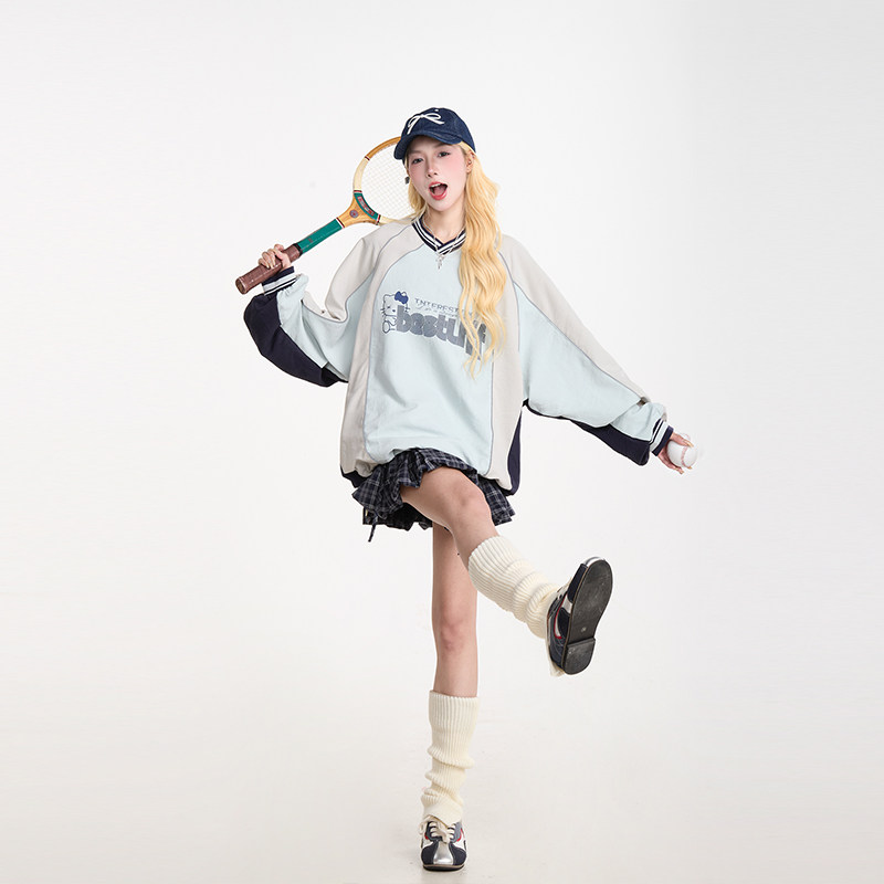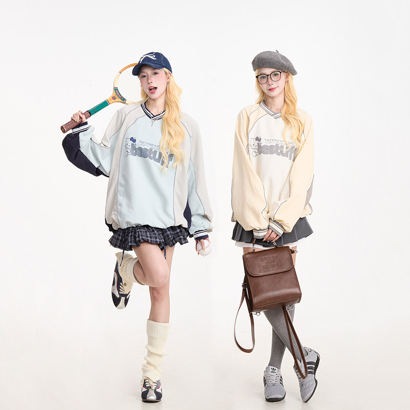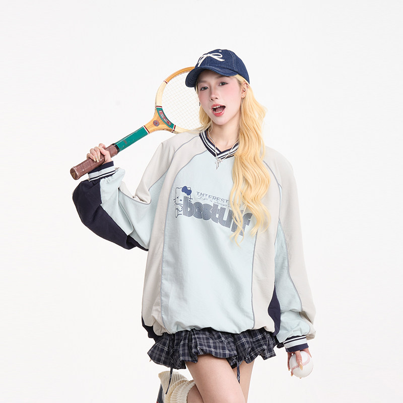 📚 NERESUM运动风Kitty猫印花长袖卫衣女美式撞色秋季速干宽松上衣