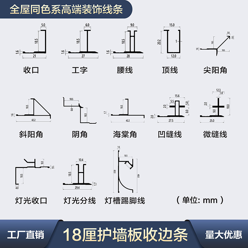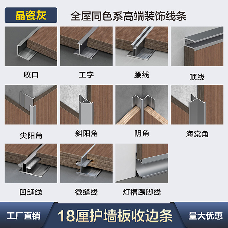 📚 18厘护墙板收口条木饰面墙板收边条铝合金工字收口金属线条晶瓷灰