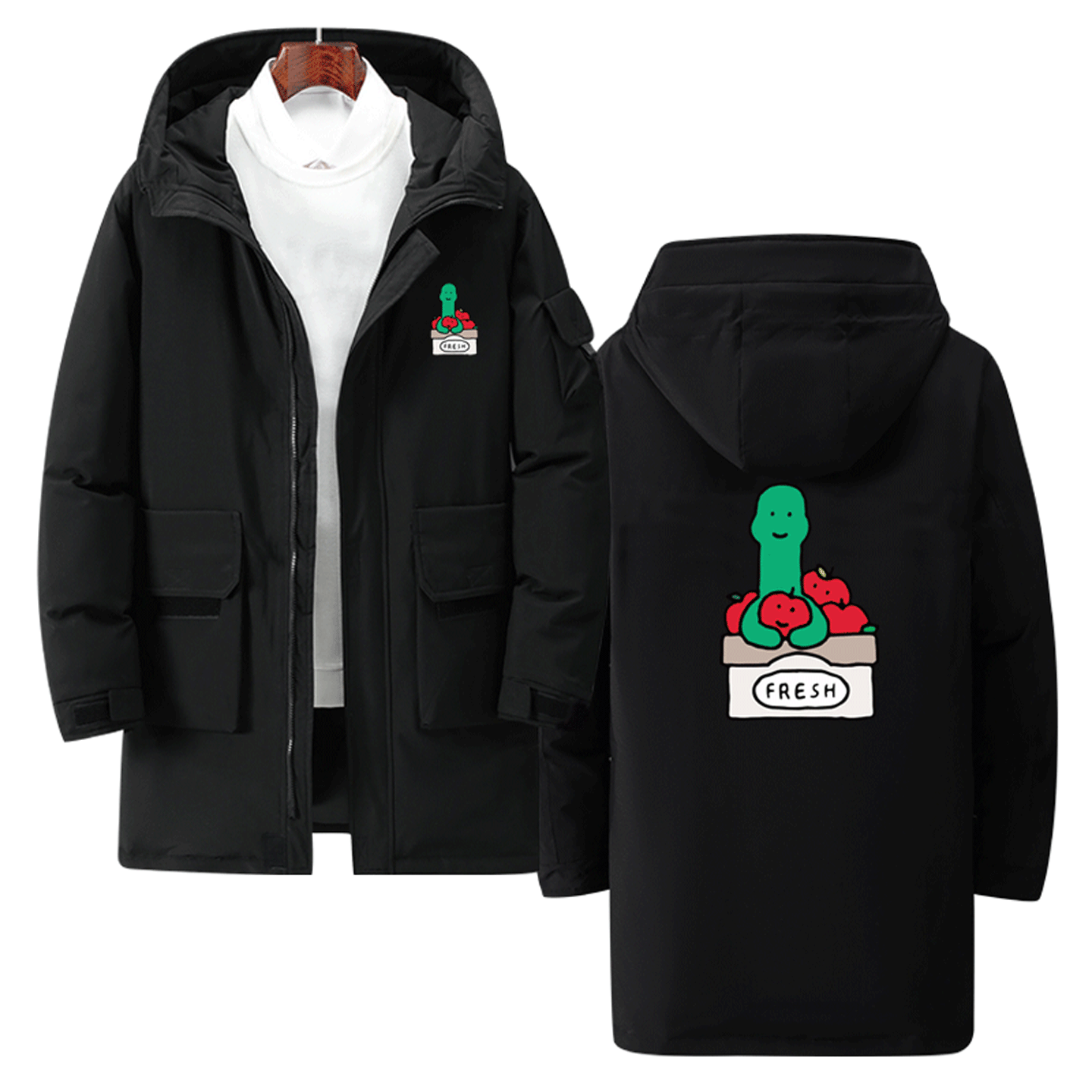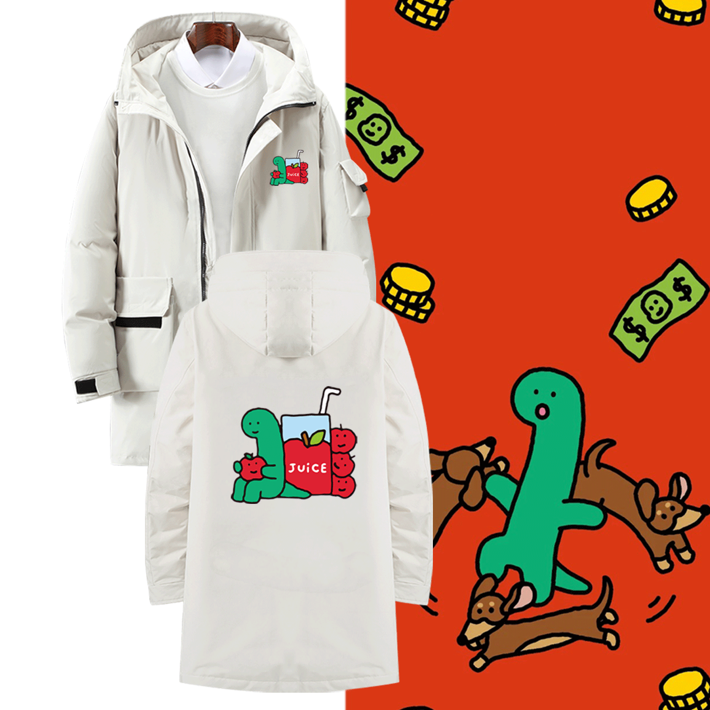 📚 男女情侣定制中长款羽绒服JOGUMAN乔古漫绿色小恐龙苹果卡通可爱