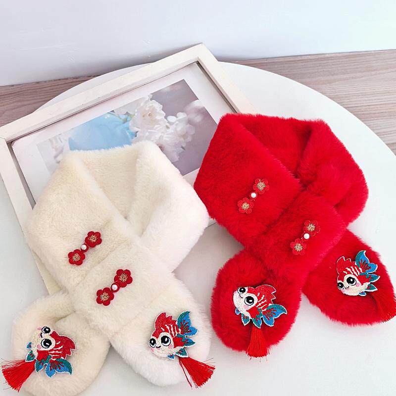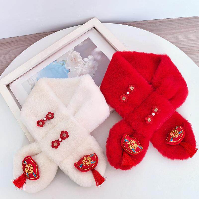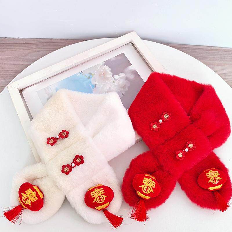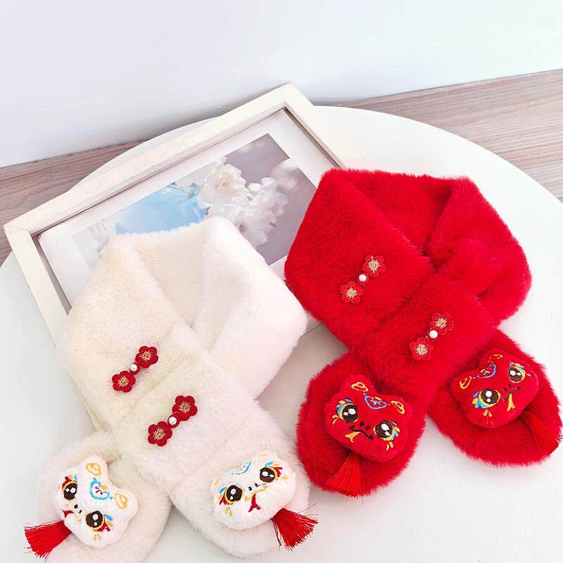 📚 新年红色围巾儿童大童女交叉围脖白色保暖毛绒柔软国风潮醒狮流苏