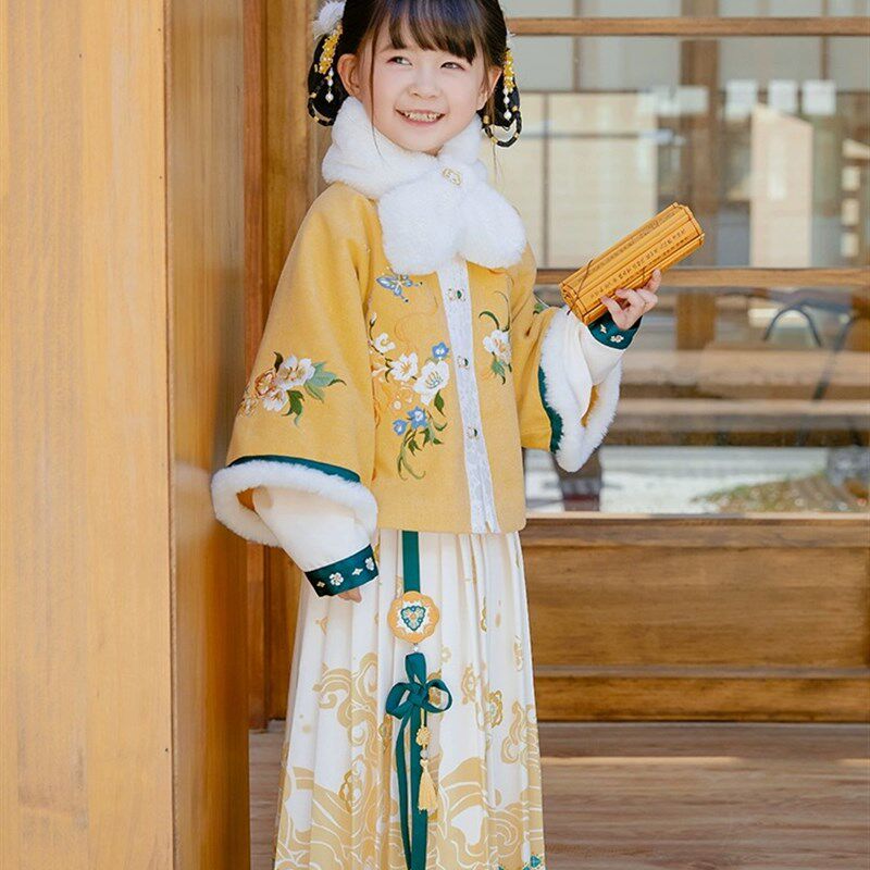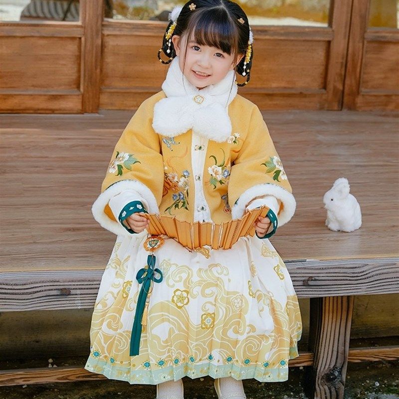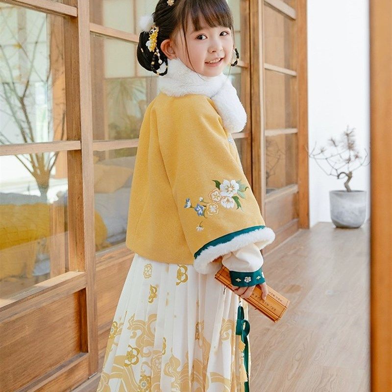 📚 女童汉服新年服拜年服明代小女孩黄色外套马面裙呢套装加绒加厚冬