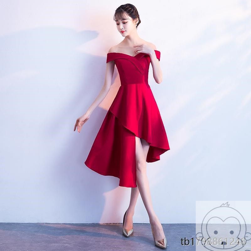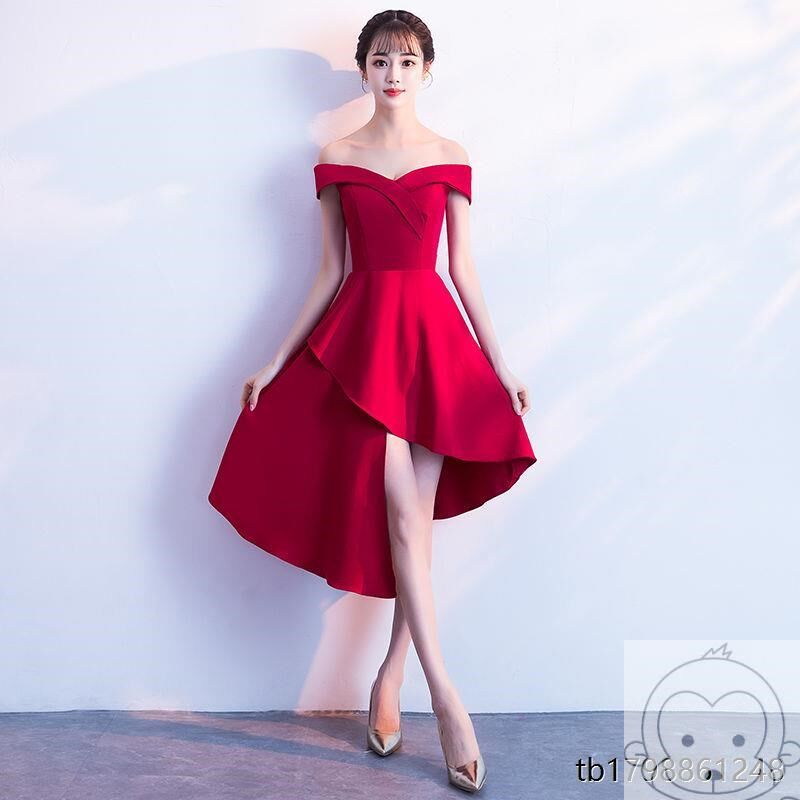 📚 敬酒服新娘2024新款夏季一字肩短款红色鱼尾小个子晚礼服连衣裙女