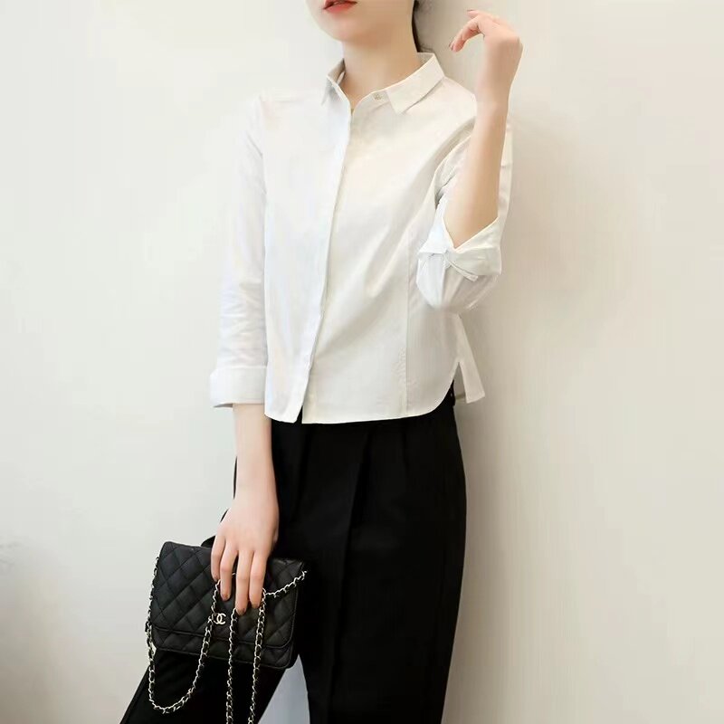 📚 早秋新款白色衬衫短装通勤休闲长袖纯棉打底衫小方领上衣白衬衣女