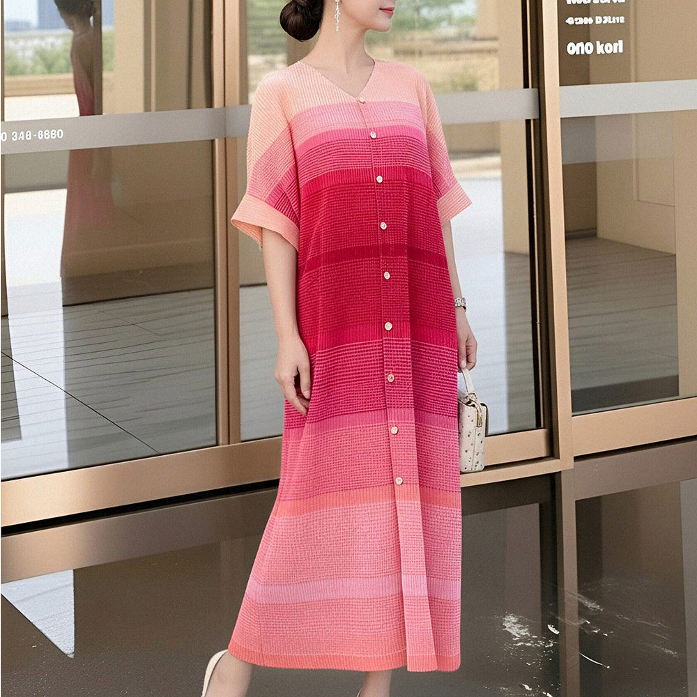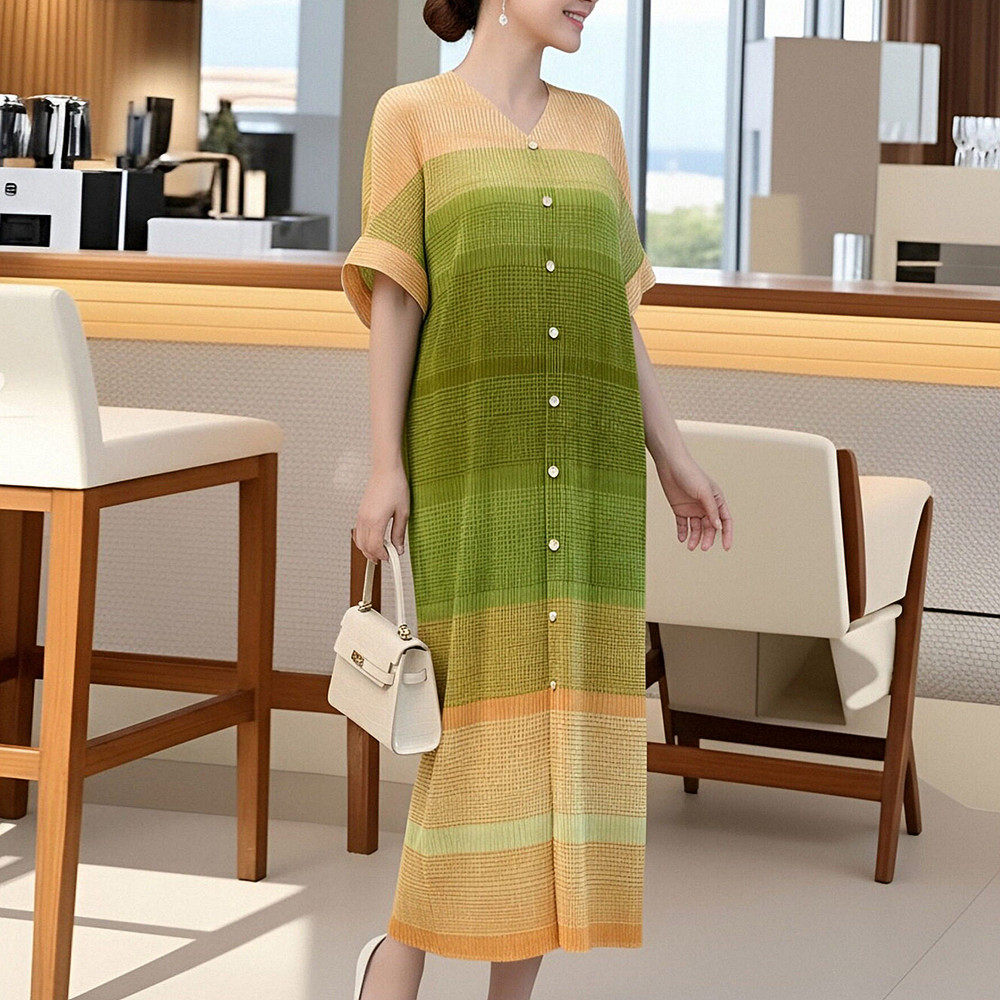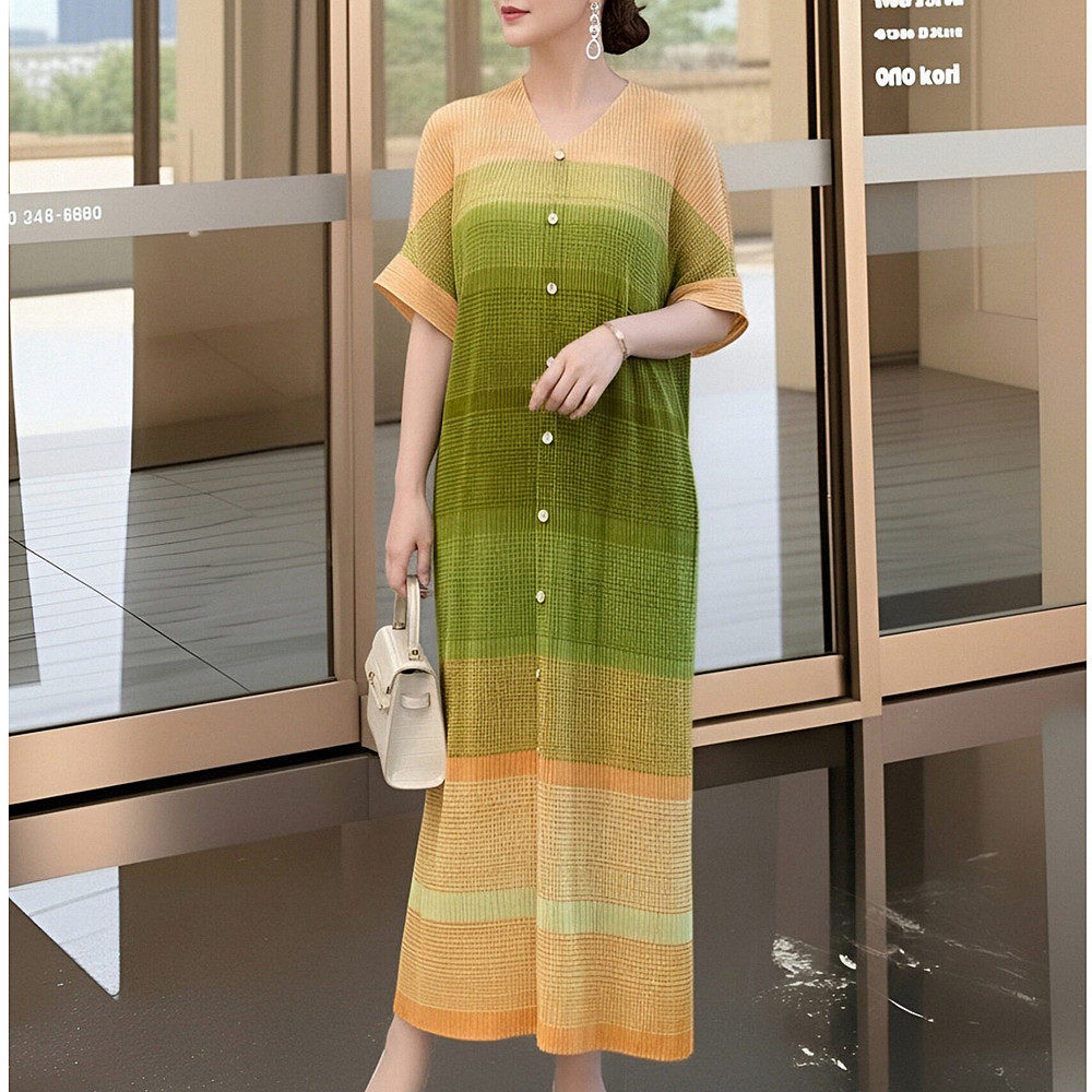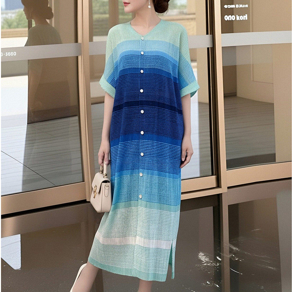 📚 时尚休闲大码渡假风开衫长裙胖女人V领宽松袖彩虹条纹褶皱连衣裙