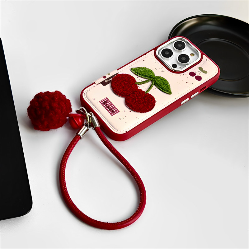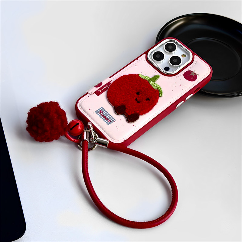 📚 趣味刺绣红番茄适用iphone16pro苹果15手机壳小众12可爱13promax带吊坠挂绳14pro全包防摔保护套皮质纹高级感