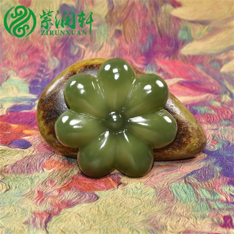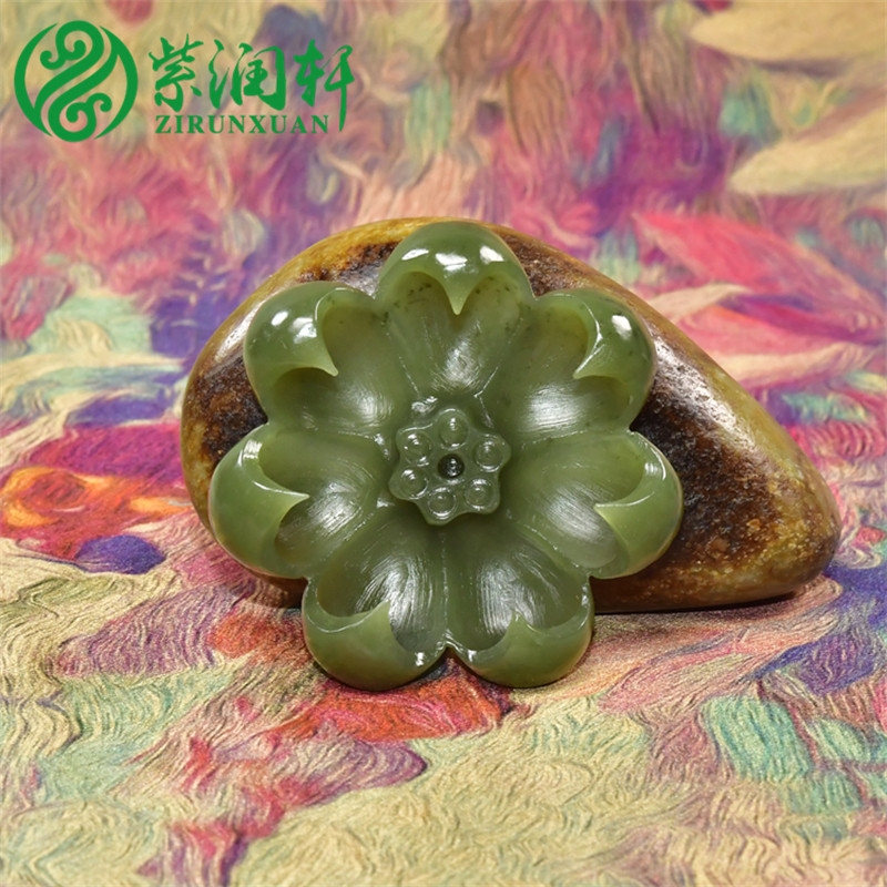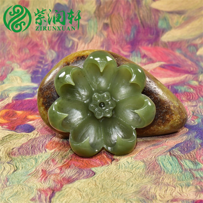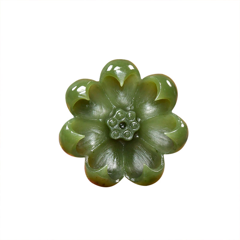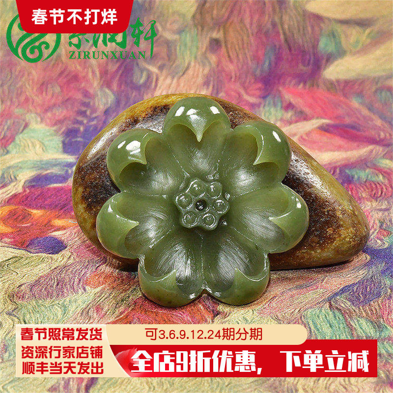 📚 紫润轩新疆和田玉玛纳斯碧菠菜绿籽料香插莲花立体小摆件哑光纯天