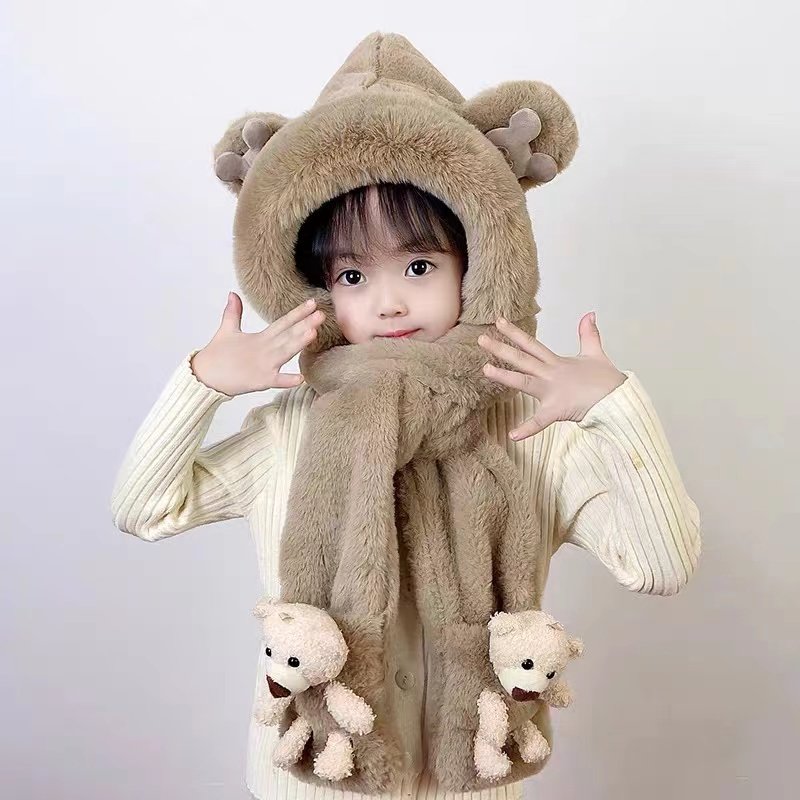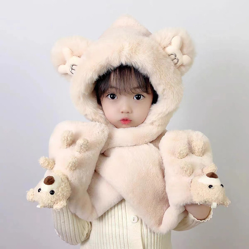 📚 儿童帽子围巾手套三件套冬季加绒加厚女童一体帽男宝宝防风帽亲子