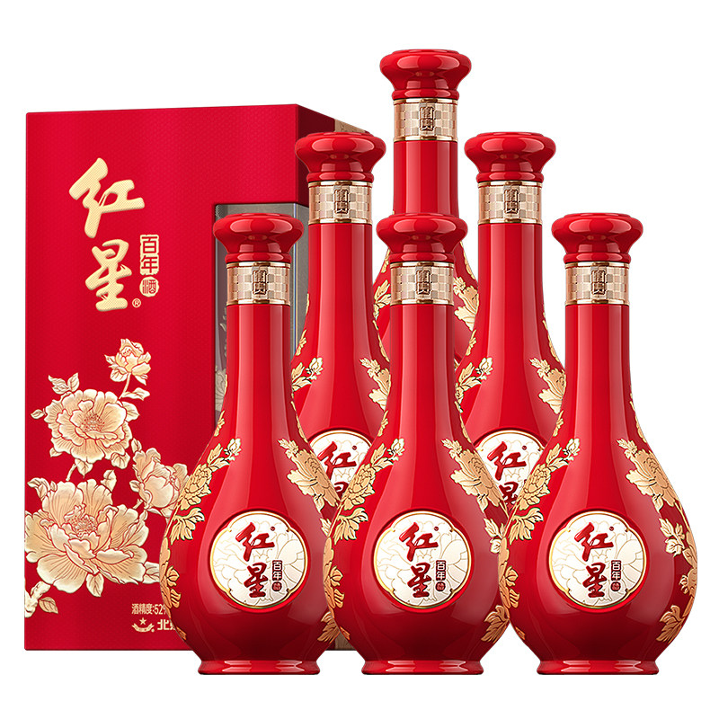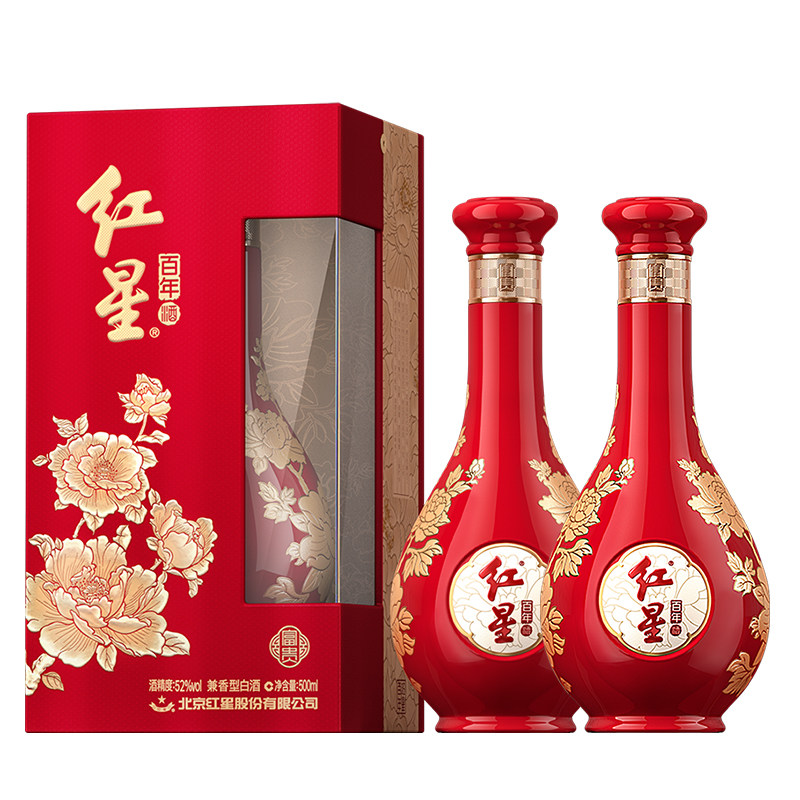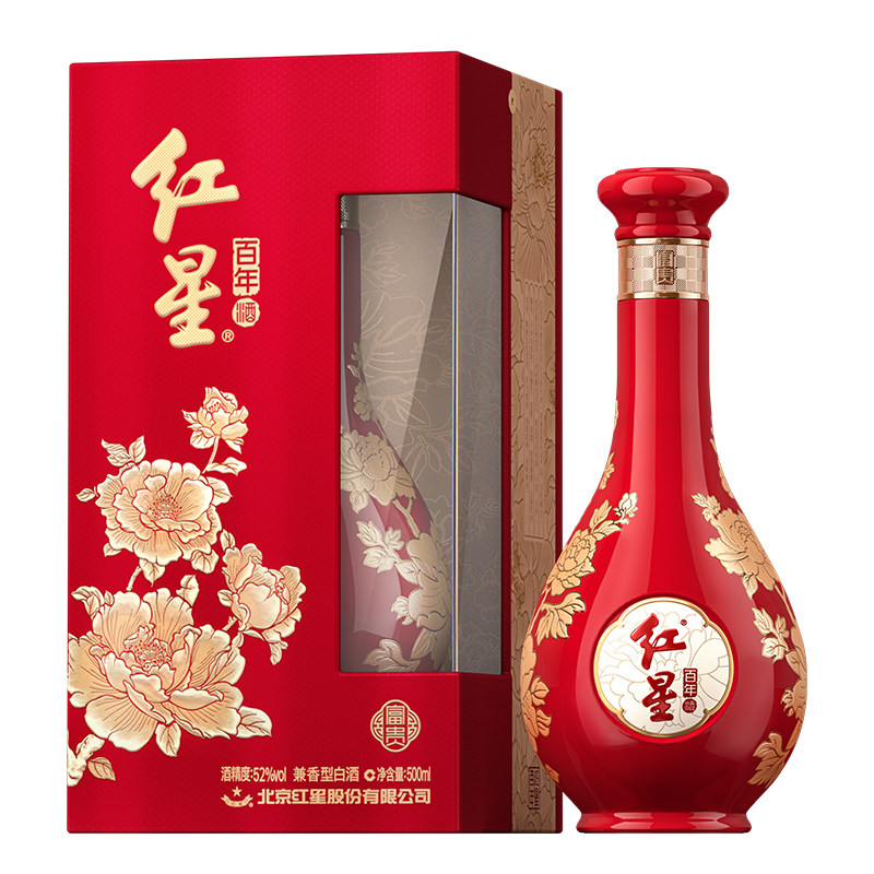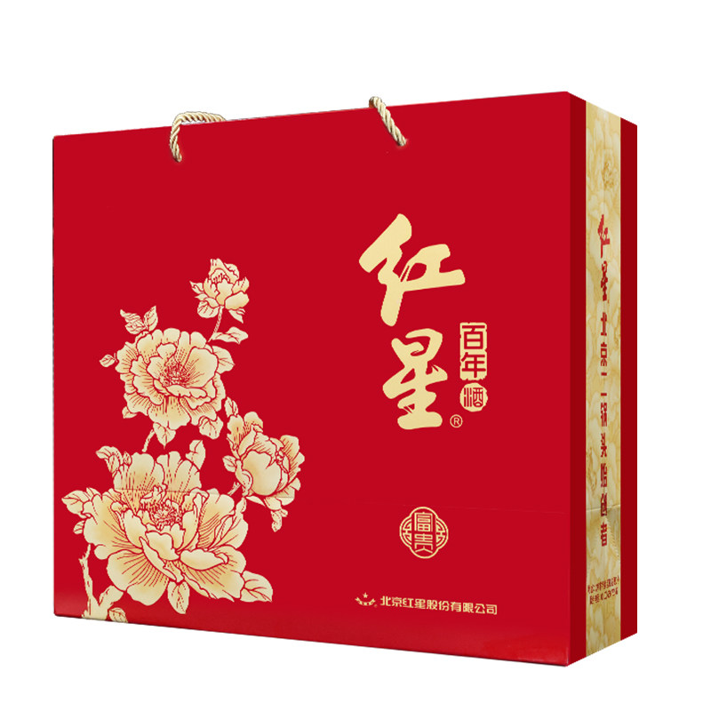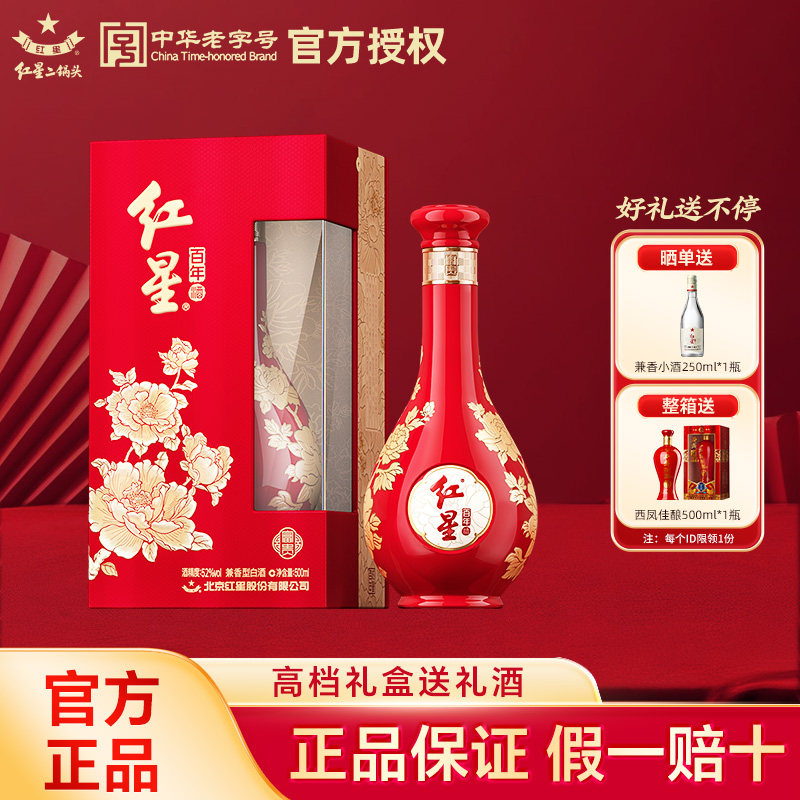 📚 官方授权红星二锅头52度富贵花开百年500ml纯粮白酒礼盒过年送礼