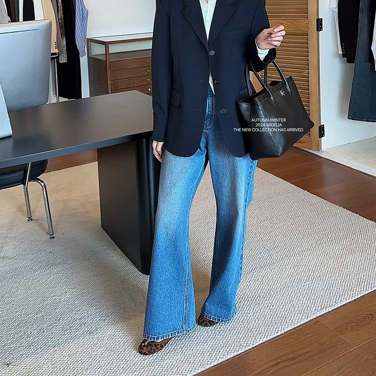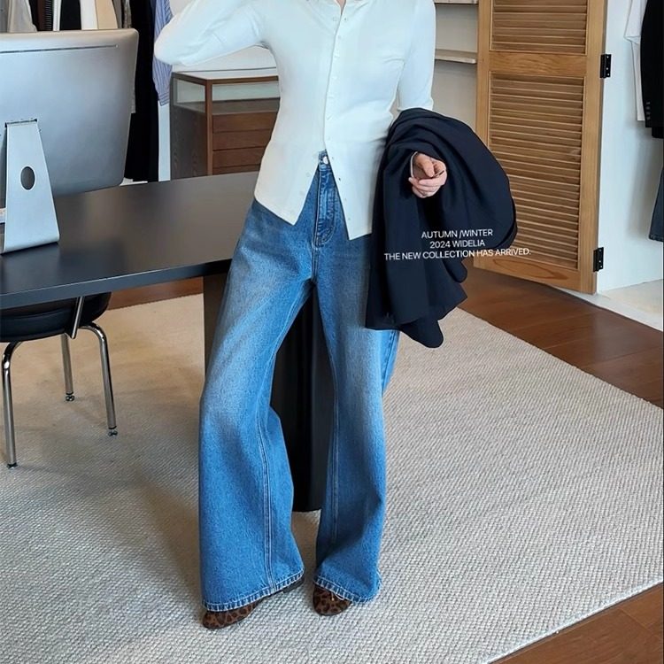 📚 widelia陈姬儿秋冬磨破蓝色窄版阔腿裤牛仔裤女韩显瘦直筒裤17012