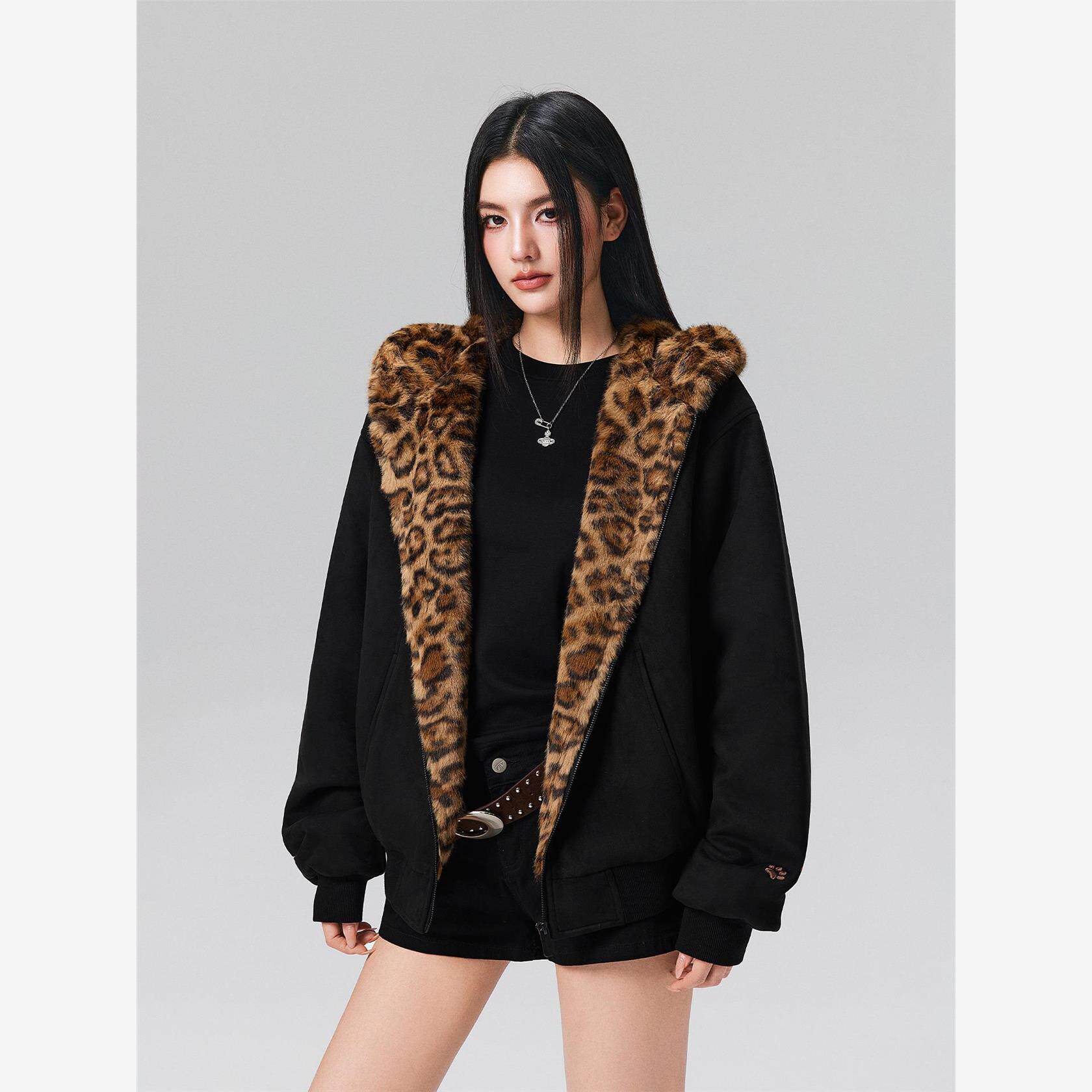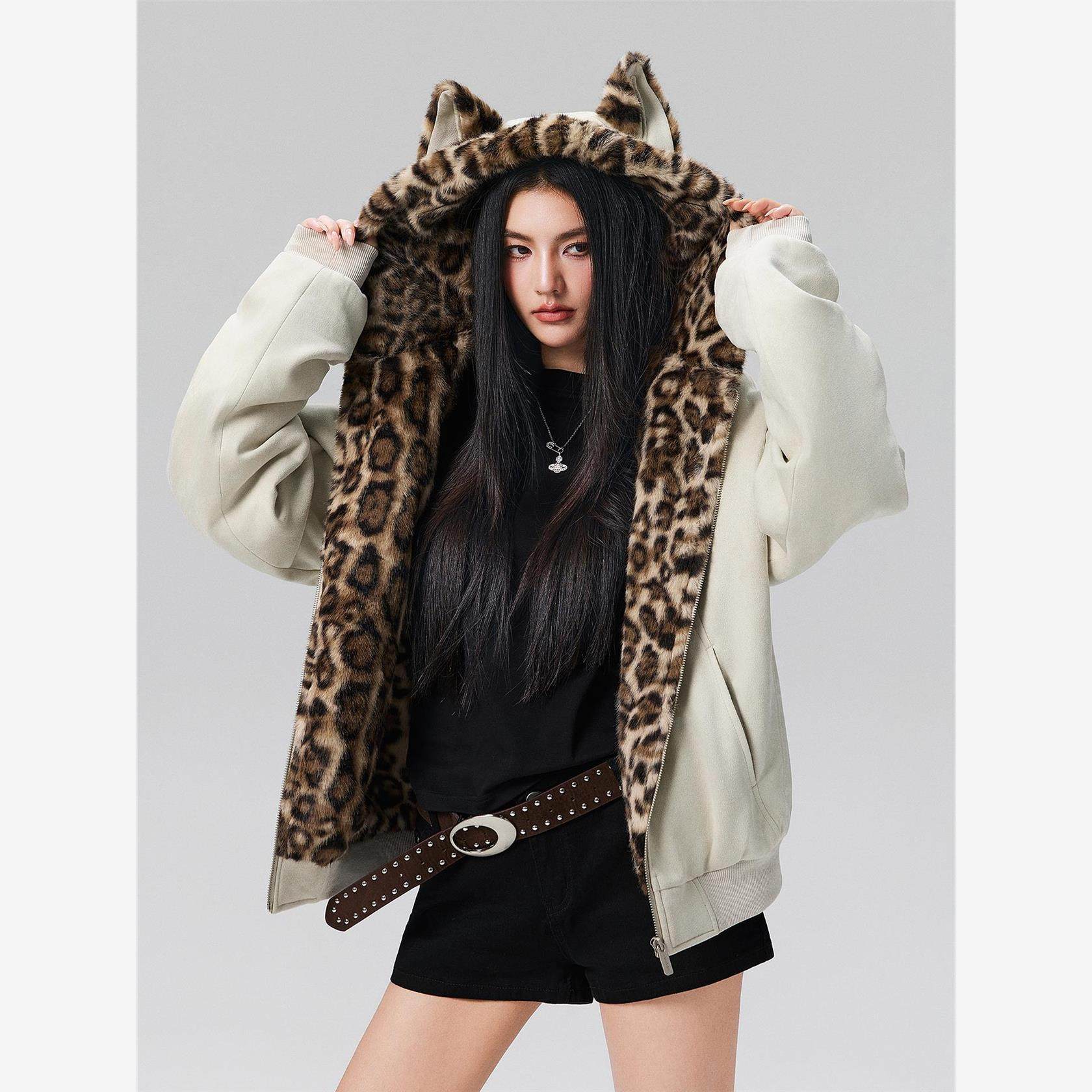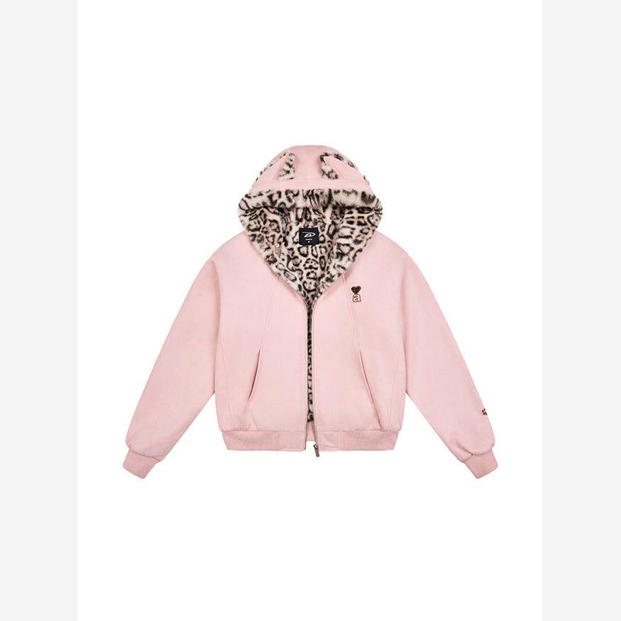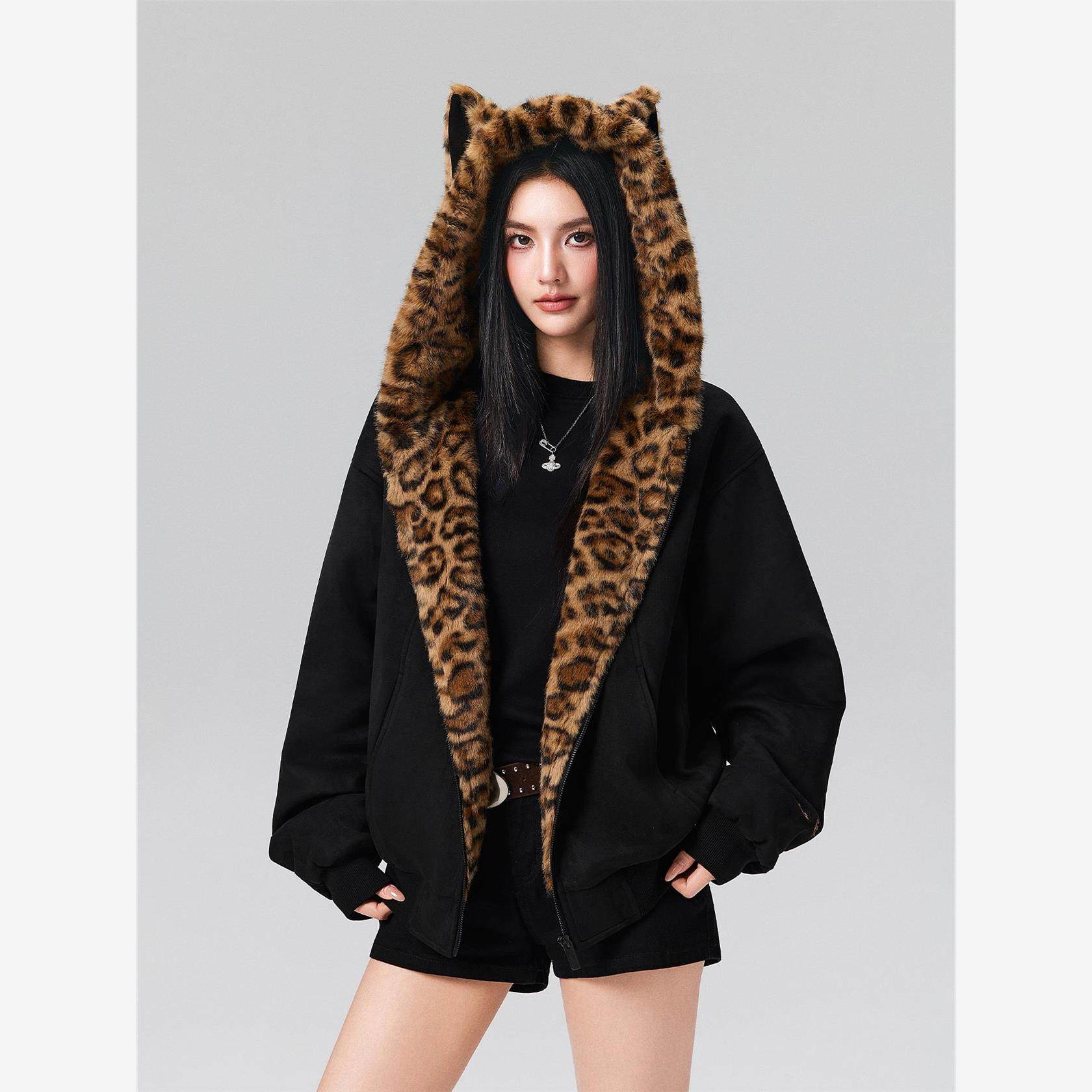 📚 【Achock官方店】秋冬可爱兔耳保暖卫衣豹纹内里拉炼连帽加绒外套