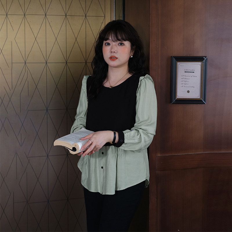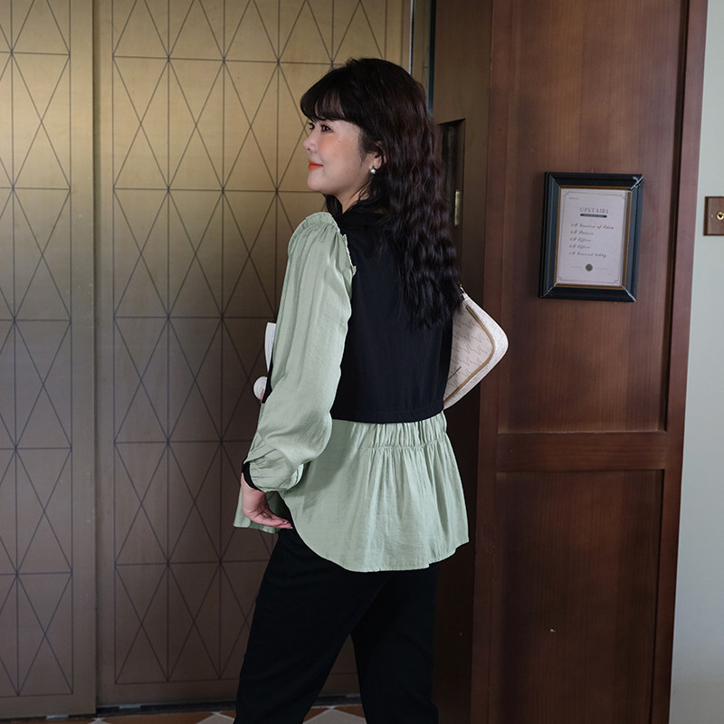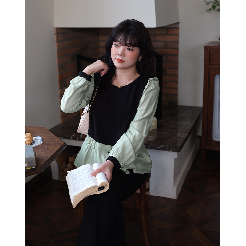 📚 蓝若水大码撞色拼接假两件衬衫春季新款胖MM设计感宽松减龄上衣女