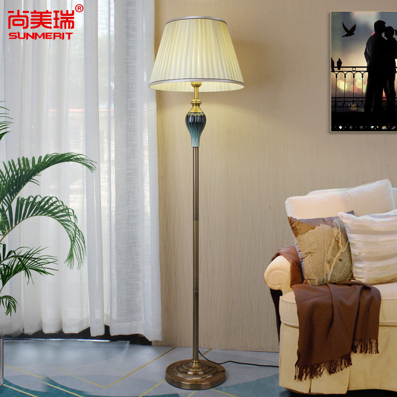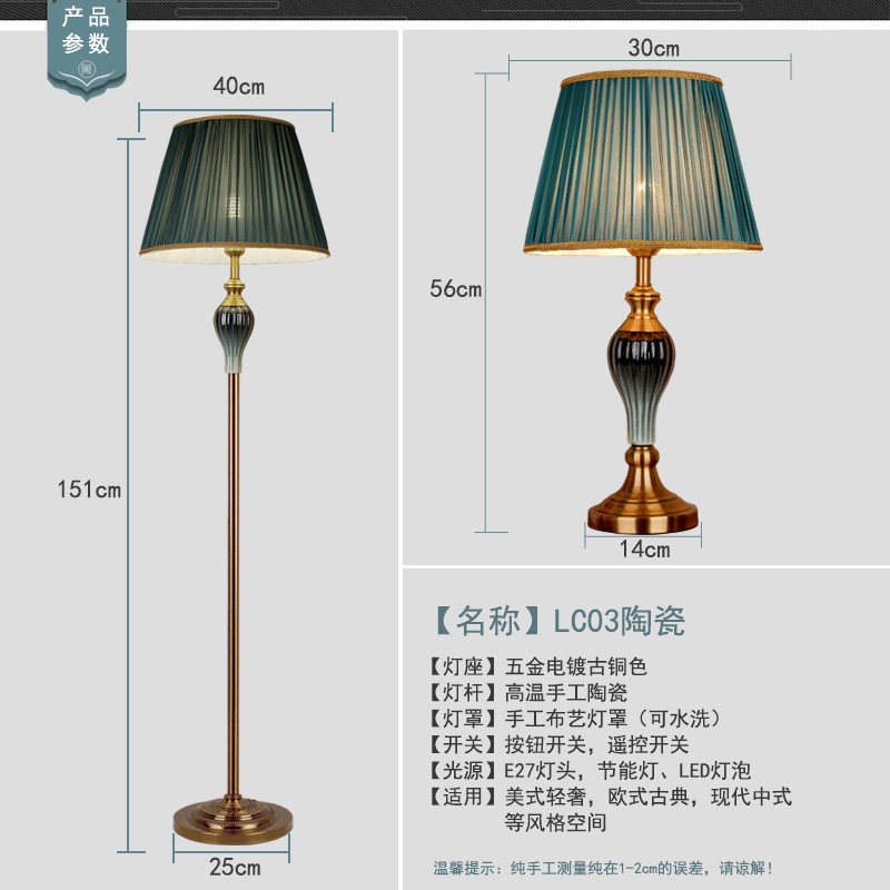 📚 美式落地灯客厅卧室台灯床头布艺立式陶瓷中式复古装饰蓝绿色遥控