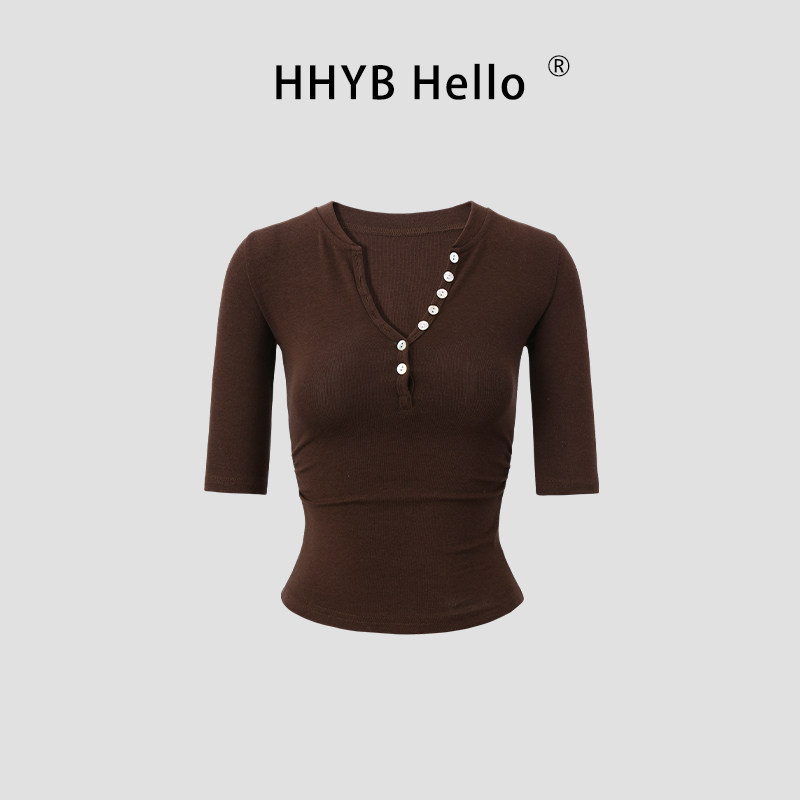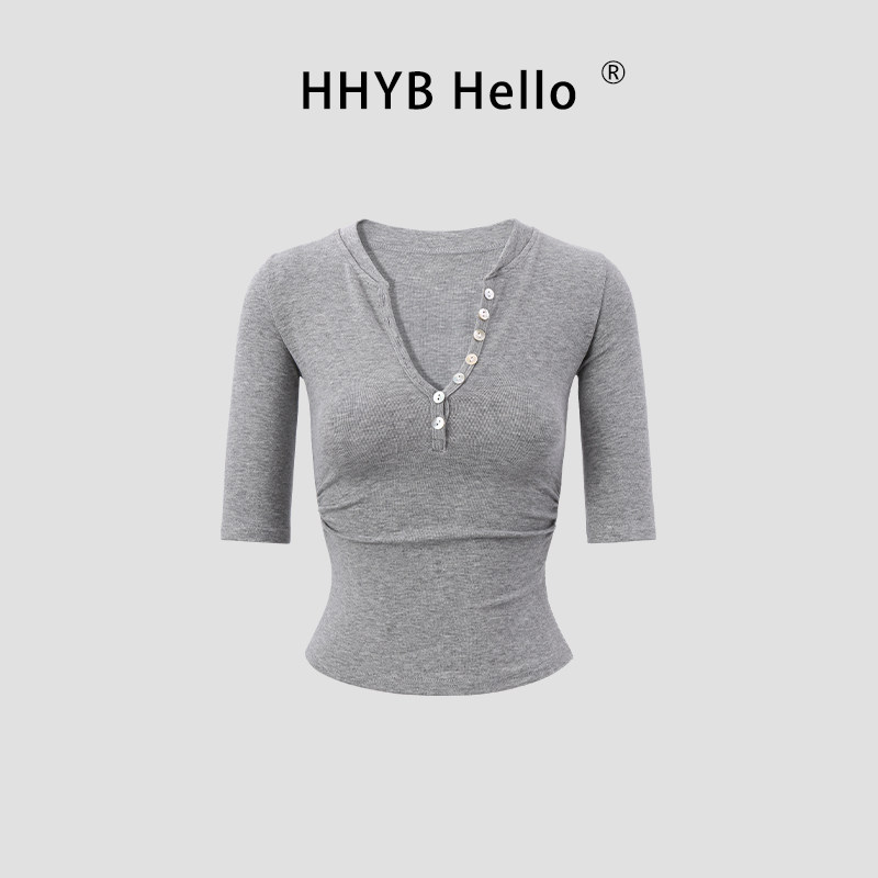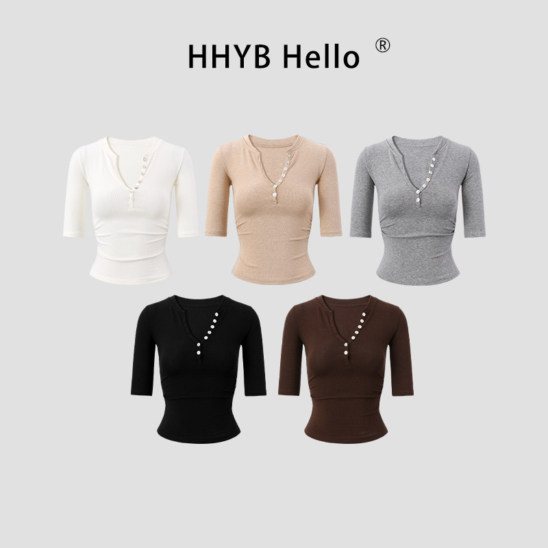 📚 HHYB别来无恙 抽褶收腰设计五分袖中袖贝扣t恤辣妹上衣女250761