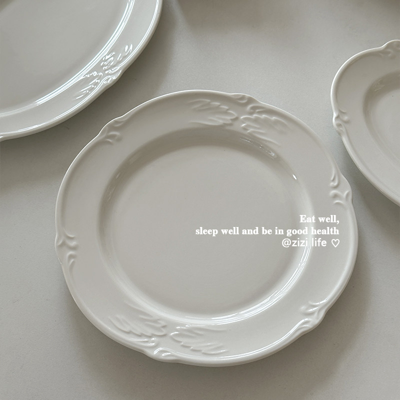 📚 ins法式纯色浮雕花边餐盘家用甜品盘炒菜盘复古陶瓷餐具点心盘