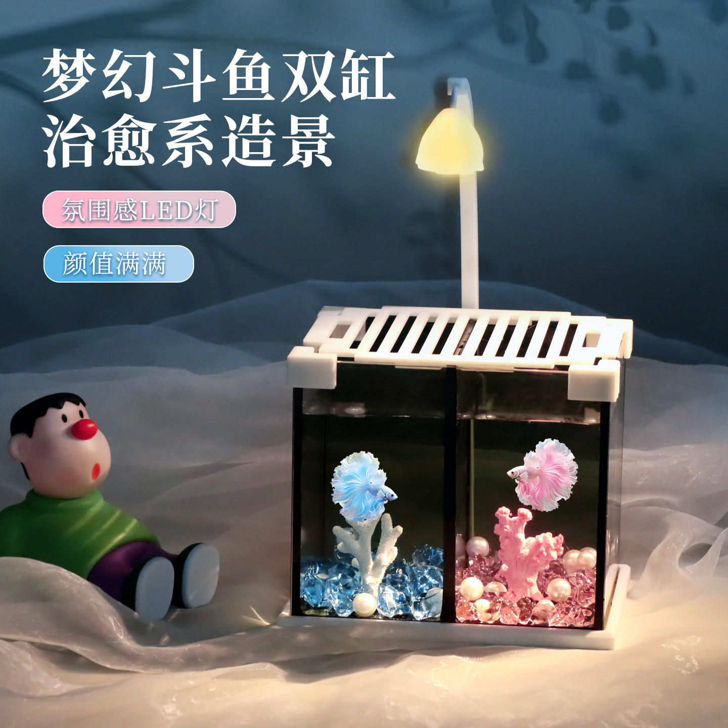 📚 超白斗鱼缸泰国斗鱼专用黑胶双缸高清金晶超白玻璃小型桌面水族