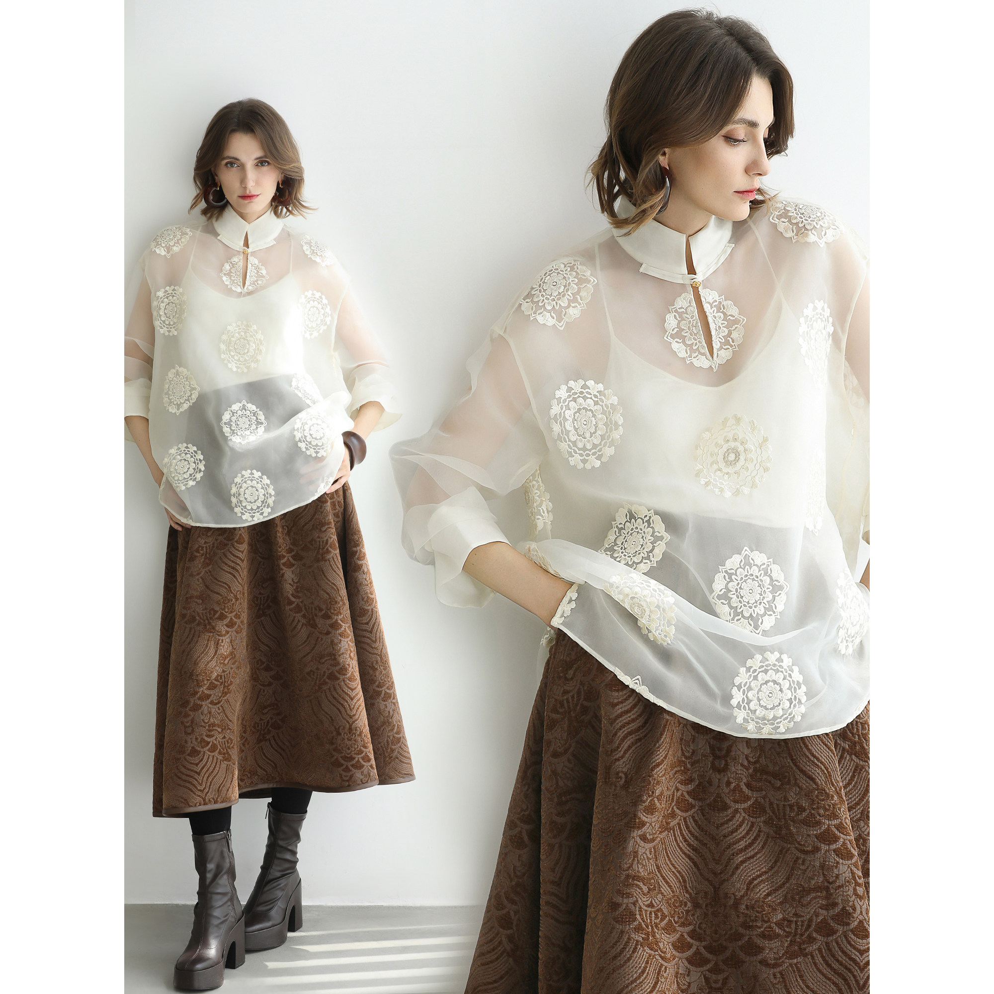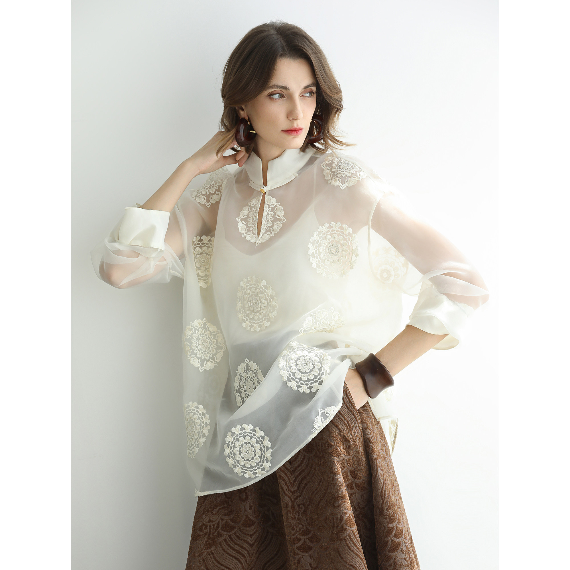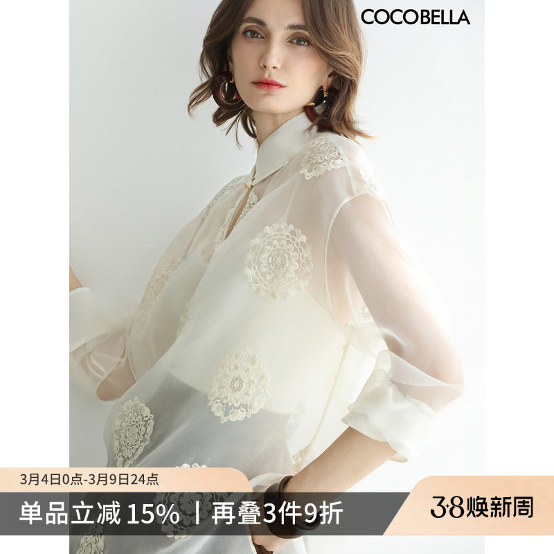 📚 COCOBELLA新中式白色绣花气质衬衫国风立领微透内搭上衣SR3228-2