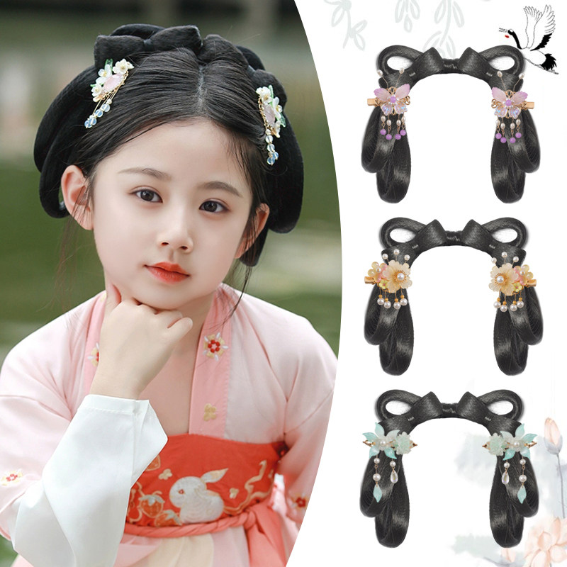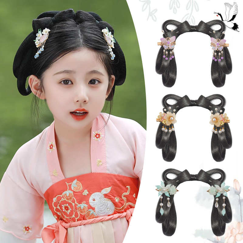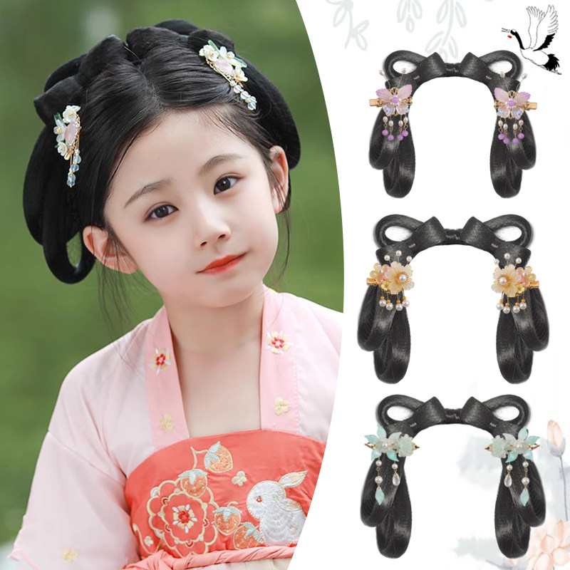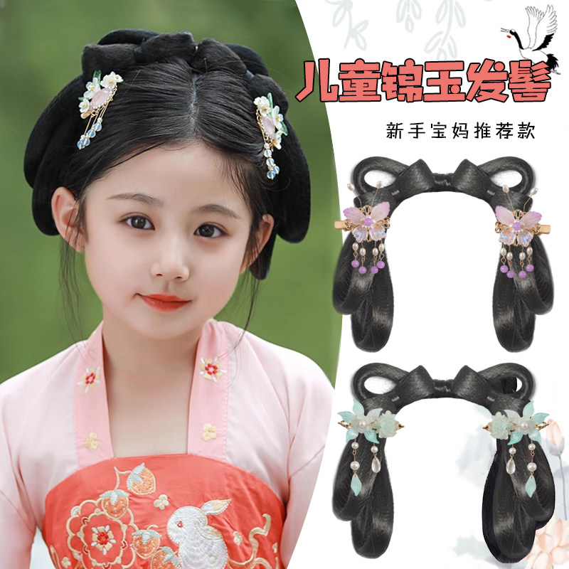 🌸 古风新风尚,儿童古风汉服头饰一体式懒人发箍发饰,让你一秒变身古装女童表演发髻造型!💖