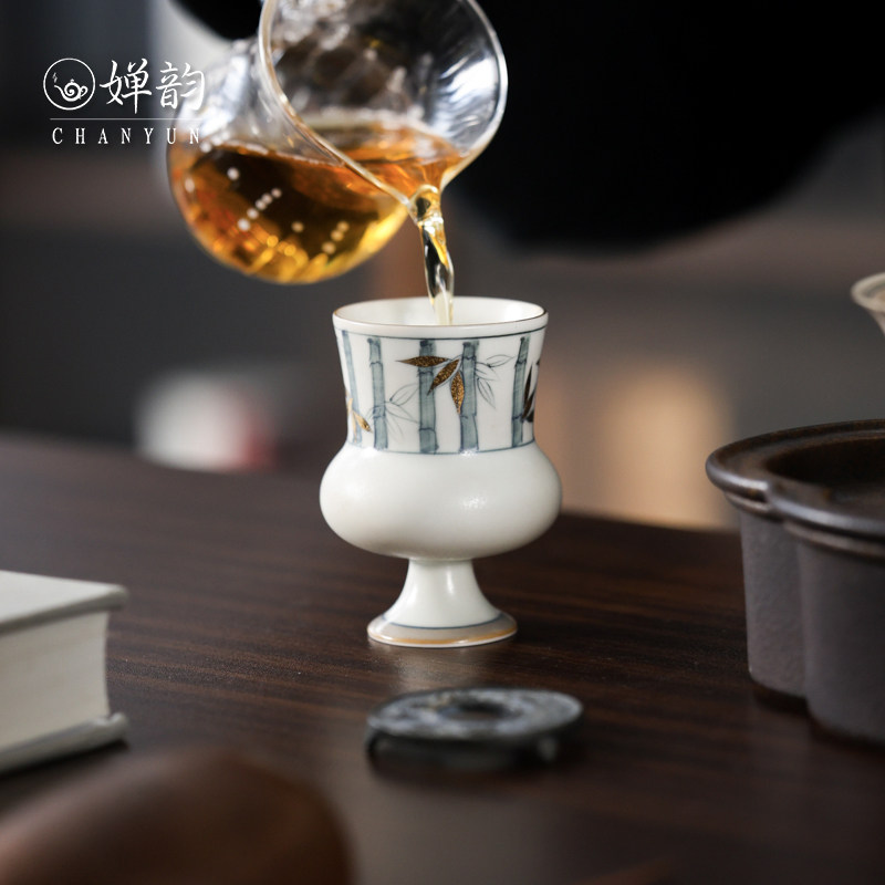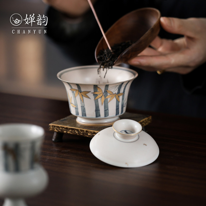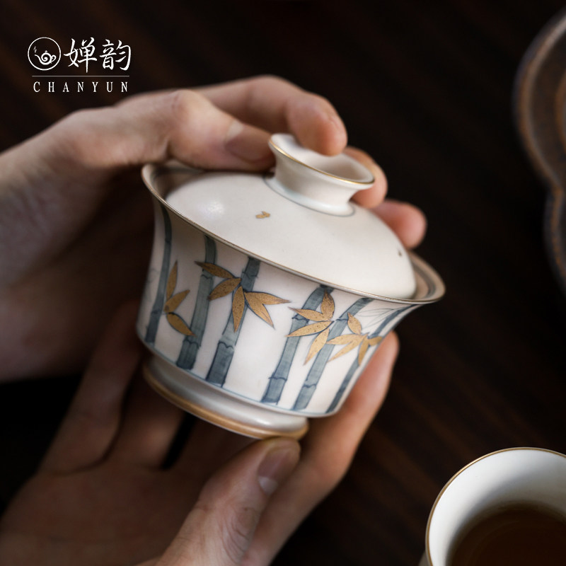 📚 婵韵 斋居描金竹子撇口盖碗茶杯单个手绘复古家用泡茶碗小田甄选
