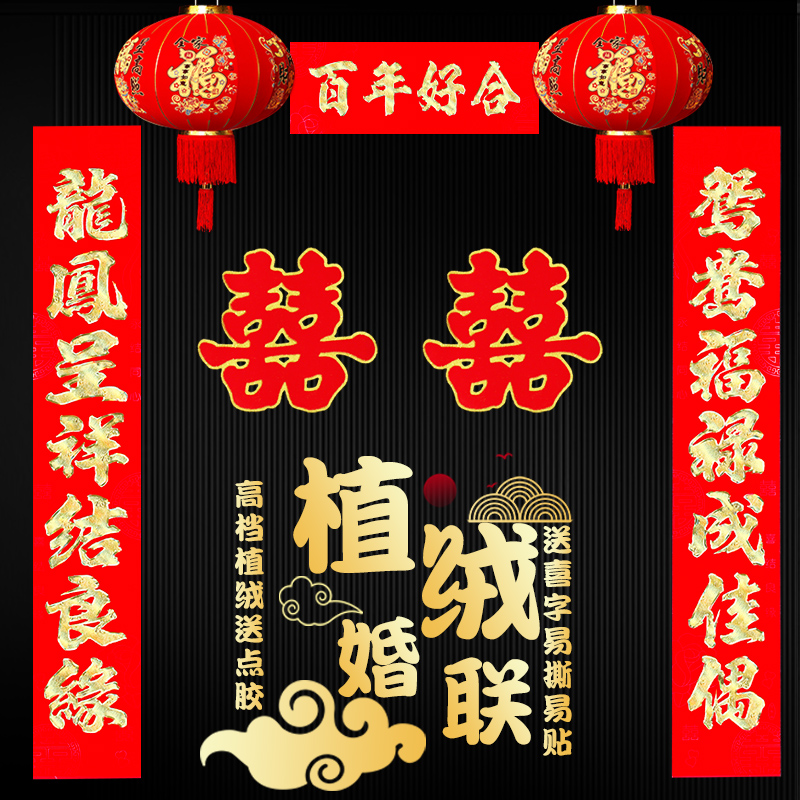 📚 结婚对联男方大门女方出嫁房门婚礼装饰酒店门口植绒喜联结婚用品