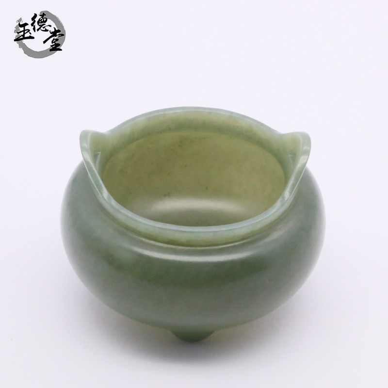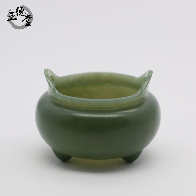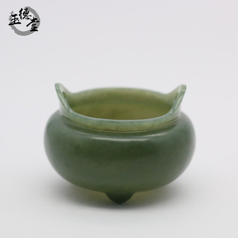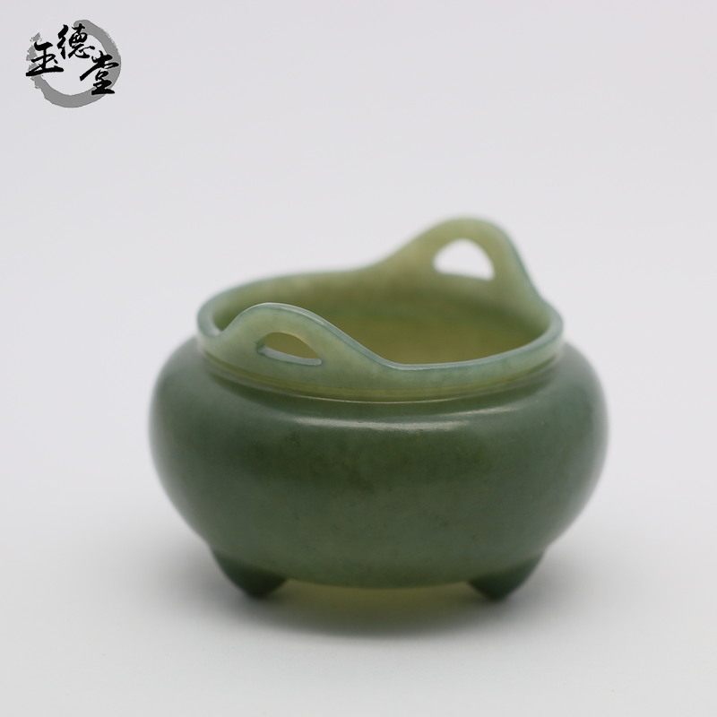 📚 玉德堂天然玉石新疆和田玉青玉苏工薄胎双耳三足香炉香插摆件香具