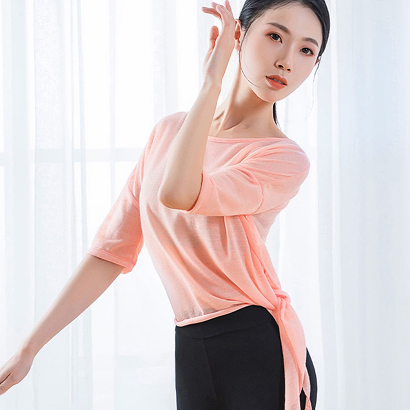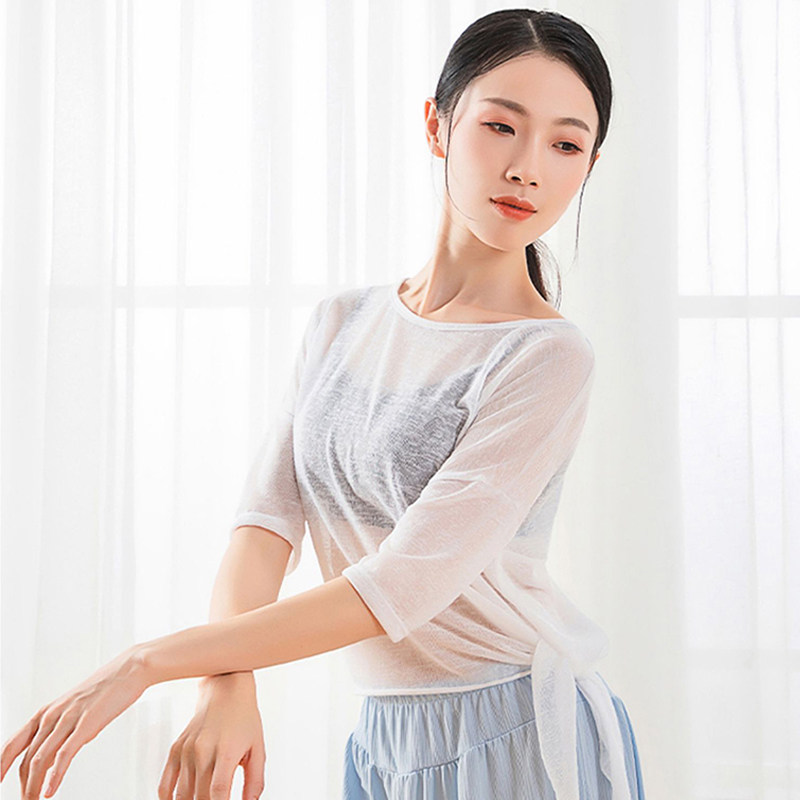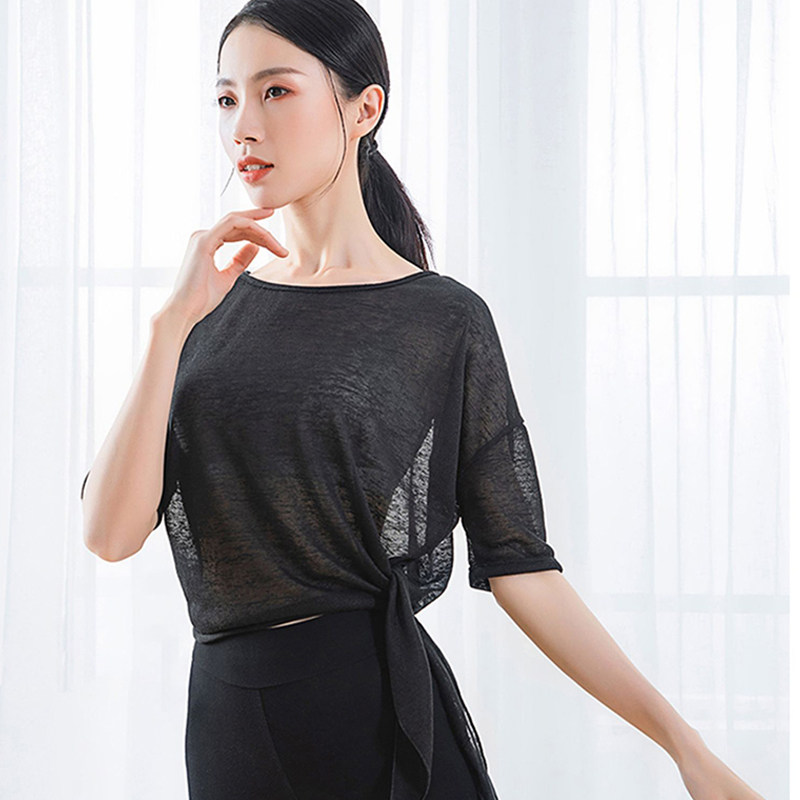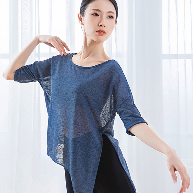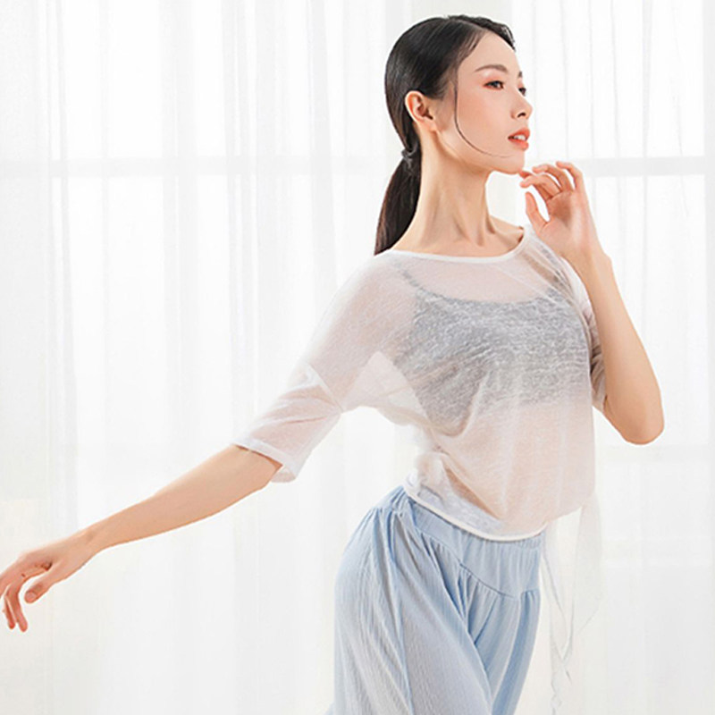 📚 宽松版运动网纱罩衫女速干夏季薄款练功服微透斜角开叉健身中长袖