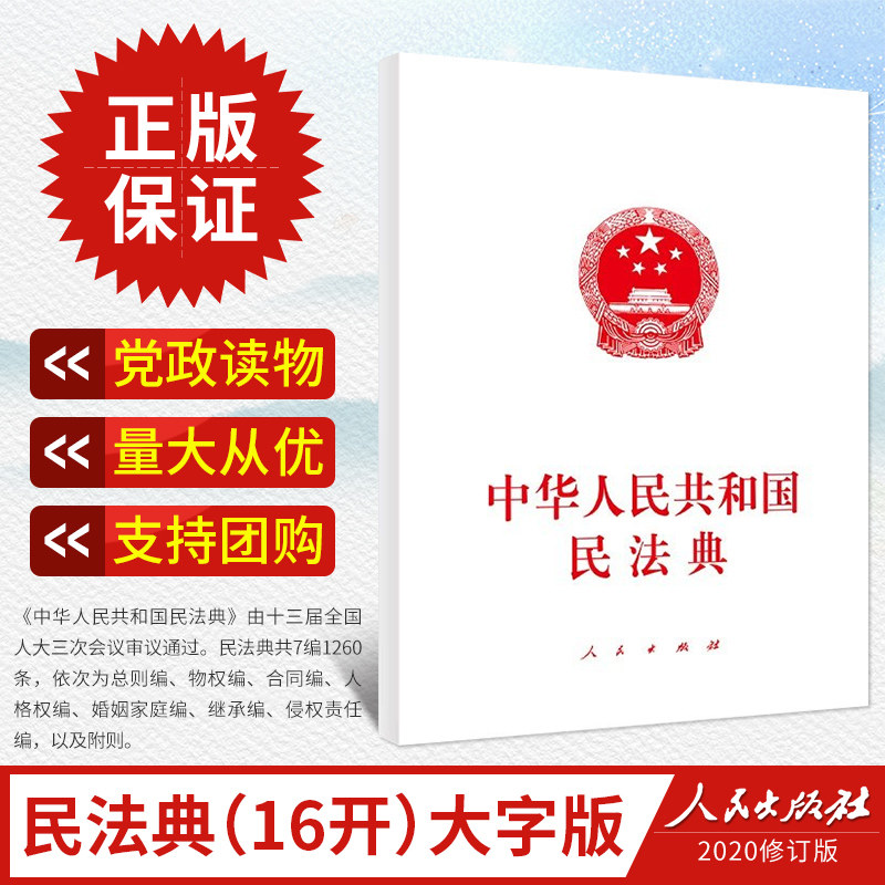 18¥ HU926 hQSX5ieGLyQ¥ https://m.tb.cn/h.ishx5K9 中华人民共和国民法典(大字本)两会书籍 16开大字本 全国两会新修订版 含总则编 物权编等 人民出版社 湖北新华正版包邮 --------------------- 【原售价】37元 【现售价】12.5元。
