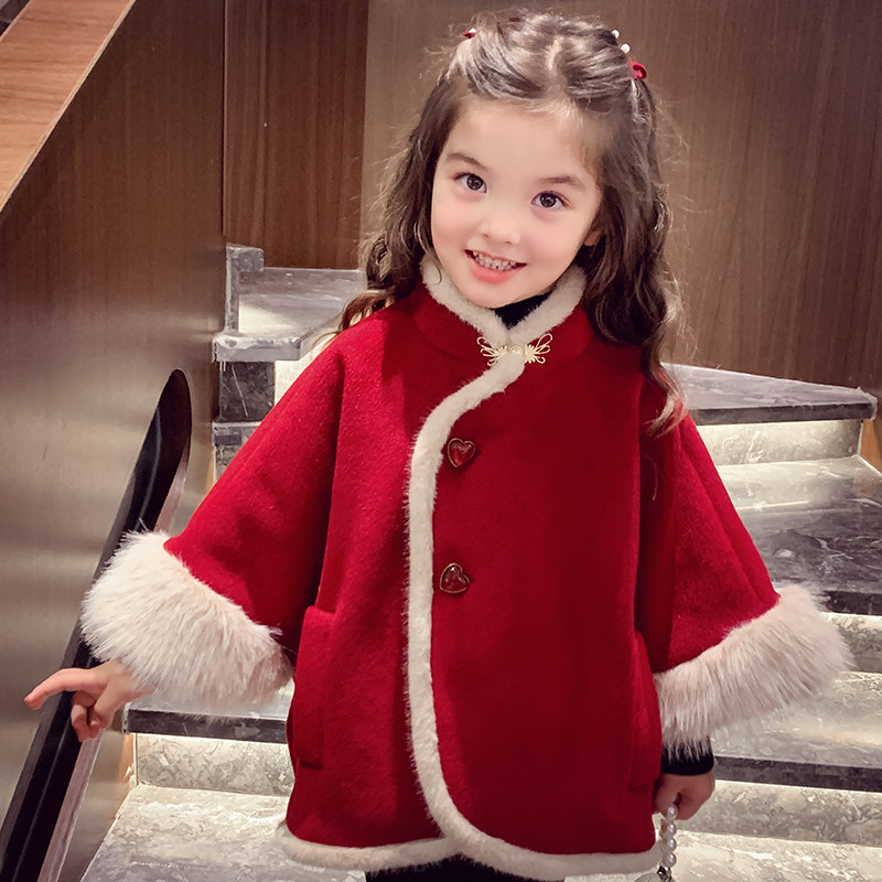 📚 女童斗篷毛呢大衣冬装2025新款洋气儿童宽松加绒红色短款呢子外套