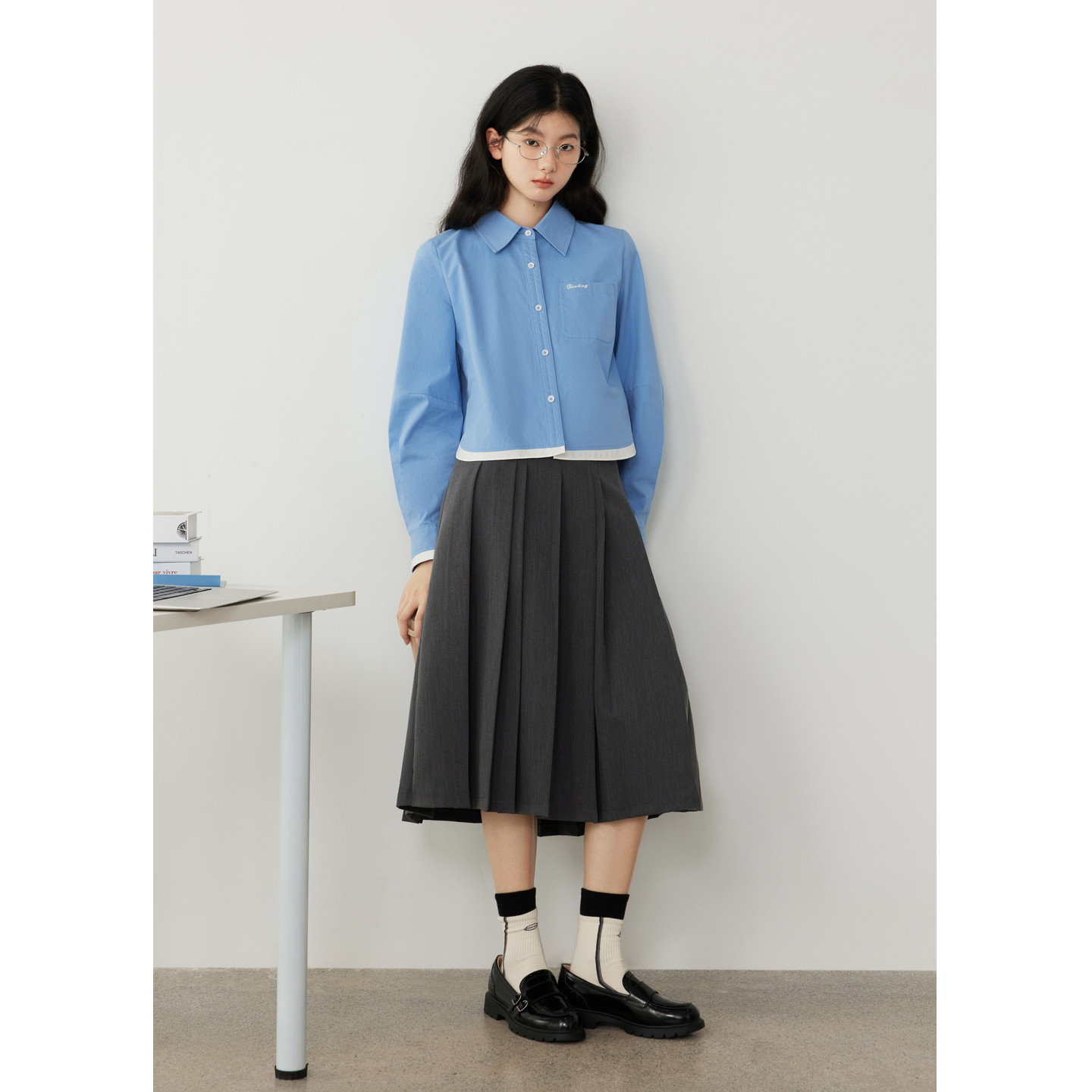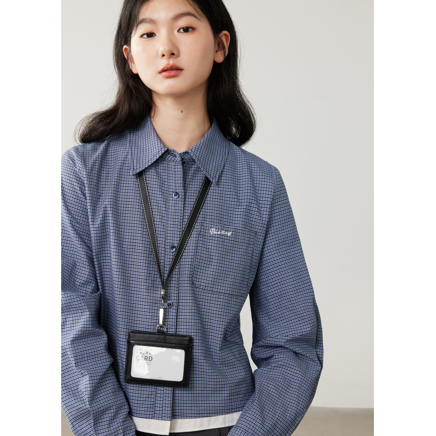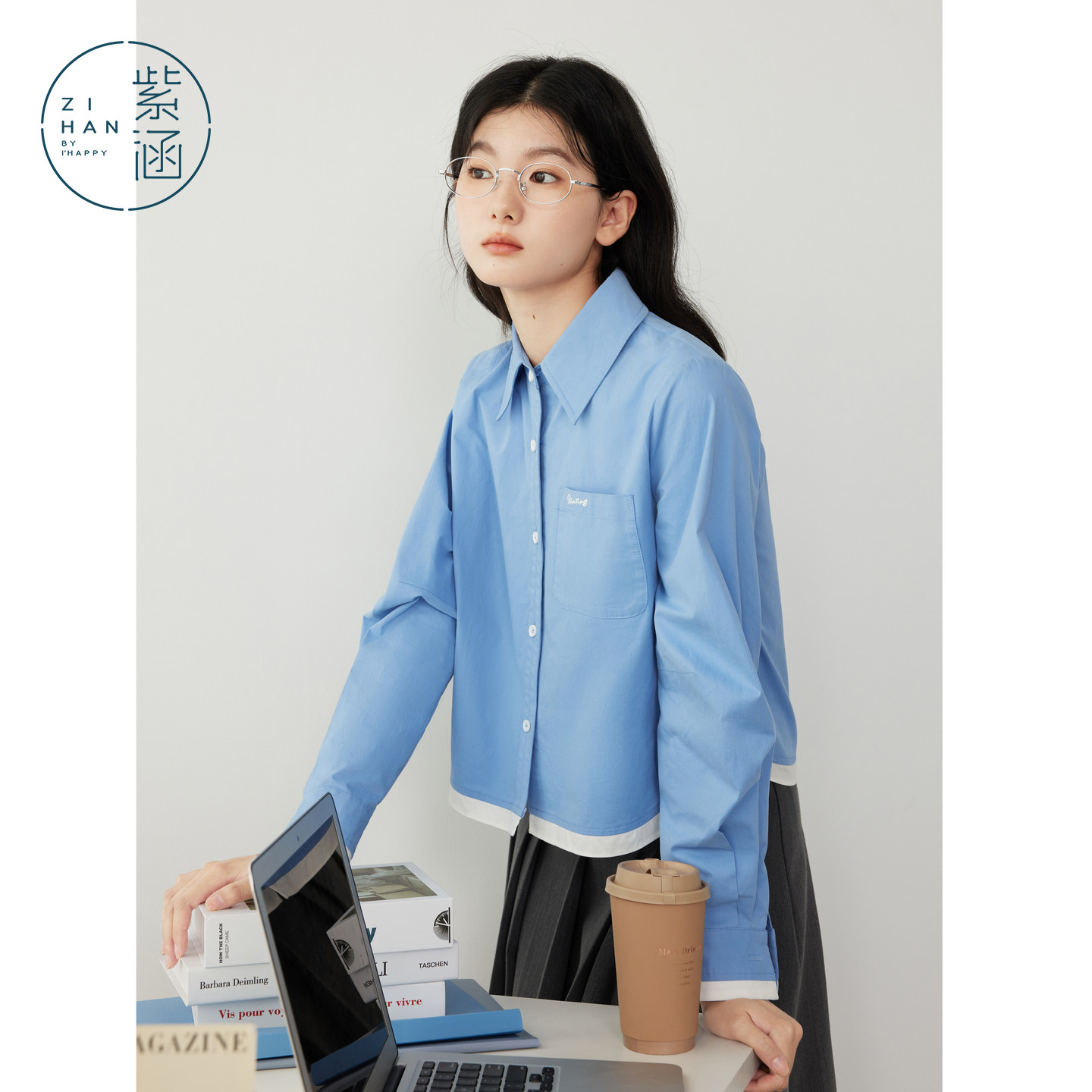 📚 紫涵撞色拼接蓝色长袖衬衫女士秋季新款高智简约通勤刺绣纯棉衬衣