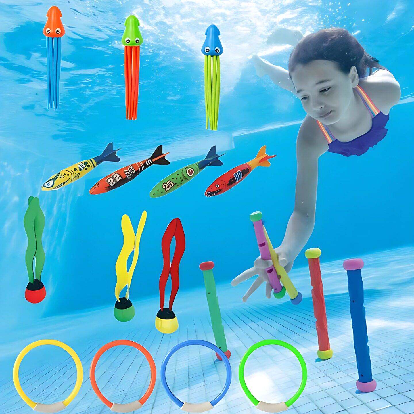 📚 儿童水下沉底鱼雷海草互动玩具小孩水底训练憋气游泳潜水棒潜水环