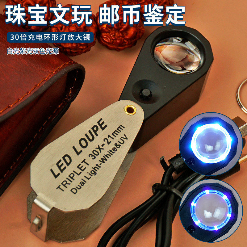 📚 珠宝放大镜30倍带led灯高清10倍20倍手持可充电折叠鉴定用钻玉石