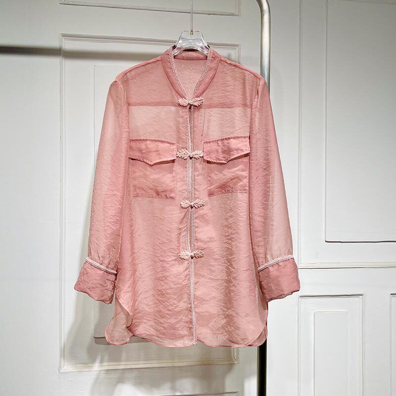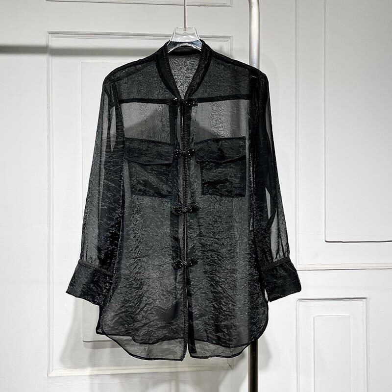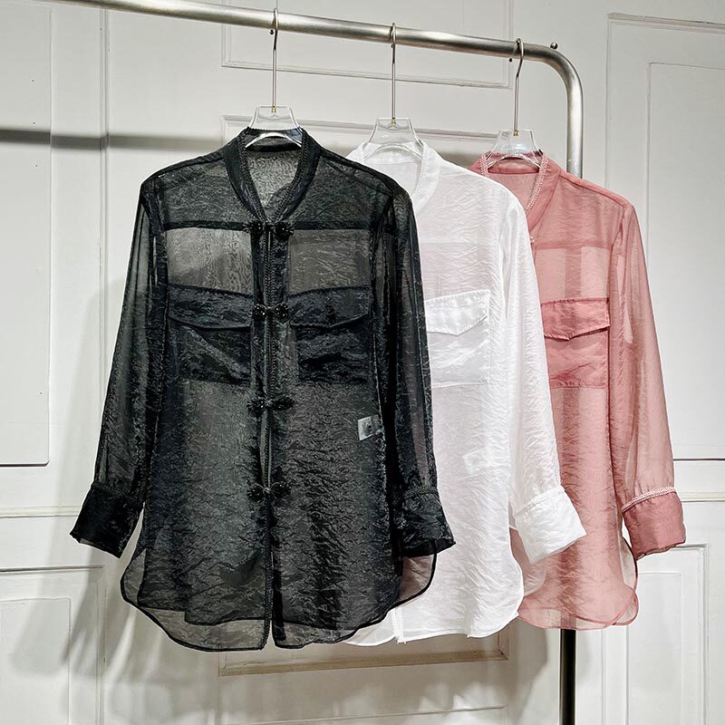 📚 中国风长袖盘扣衬衫女春季新款宽松显瘦气质薄透暮云纱上衣潮