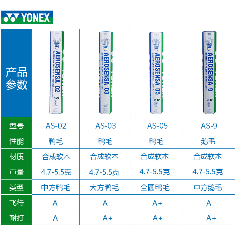 🔍详细参数:AS05、AS9、AS50和AS03都是YONEX的专业YY系列,专为专业羽毛球爱好者设计。这款羽毛球的性能非常出色,无论是打球手感还是耐用性,都让人非常满意。它的羽毛材质柔软且轻盈,打起来非常顺畅,不会感到累人。