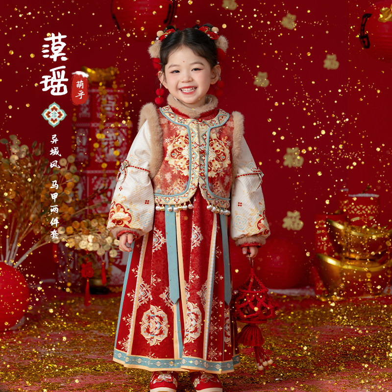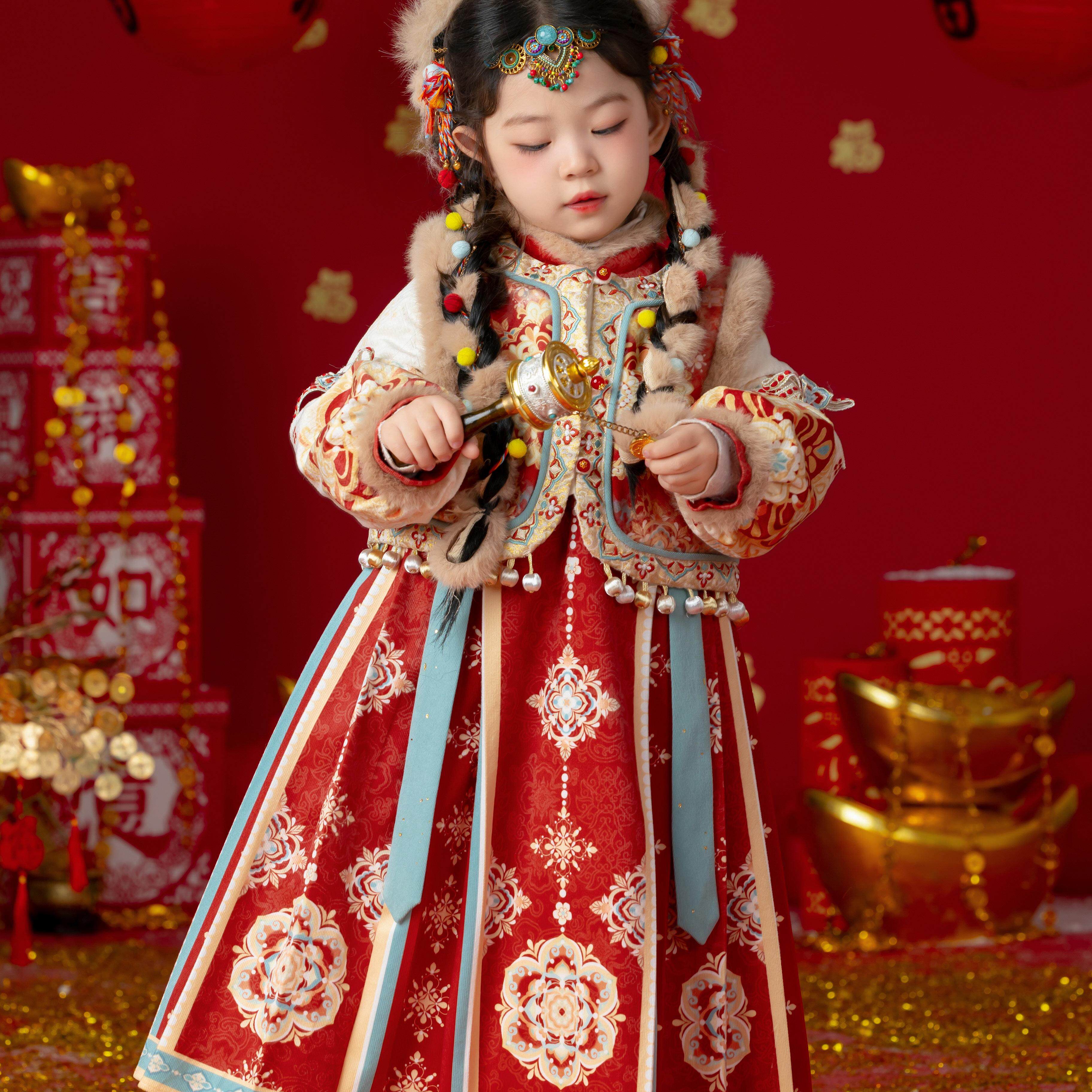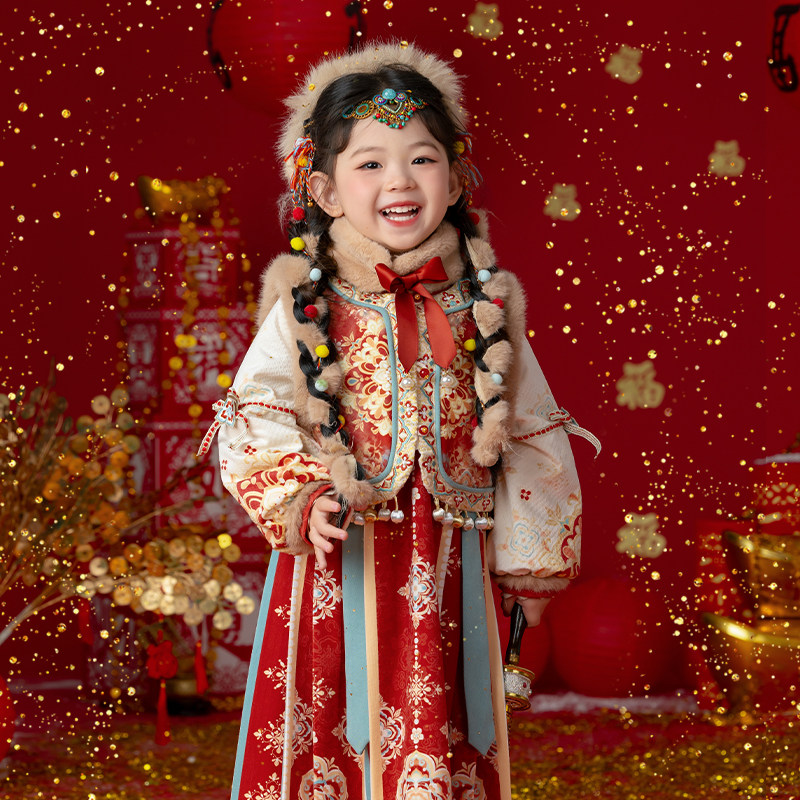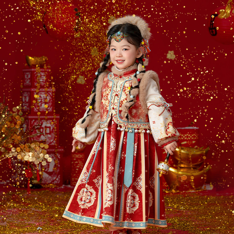 📚 古风女童汉服冬款加绒加厚西域古装少数民族公主裙儿童拜年服唐装