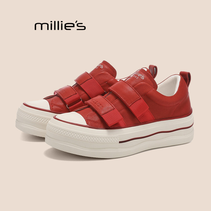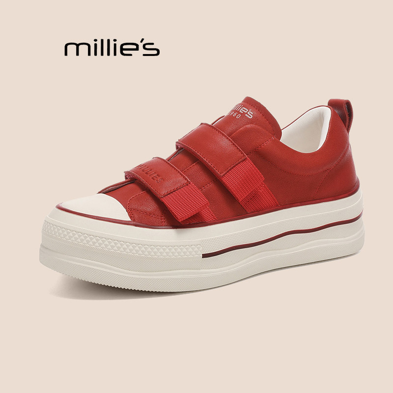 📚 MILLIE'S/妙丽红色魔术贴厚底板鞋女真皮百搭休闲鞋春季新款单鞋P