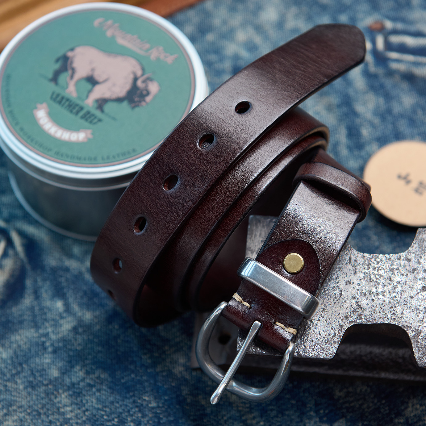 📚 山岩 复古真皮腰带 钢扣头 水染皮带柔韧细腻 3.5CM宽百搭男皮带