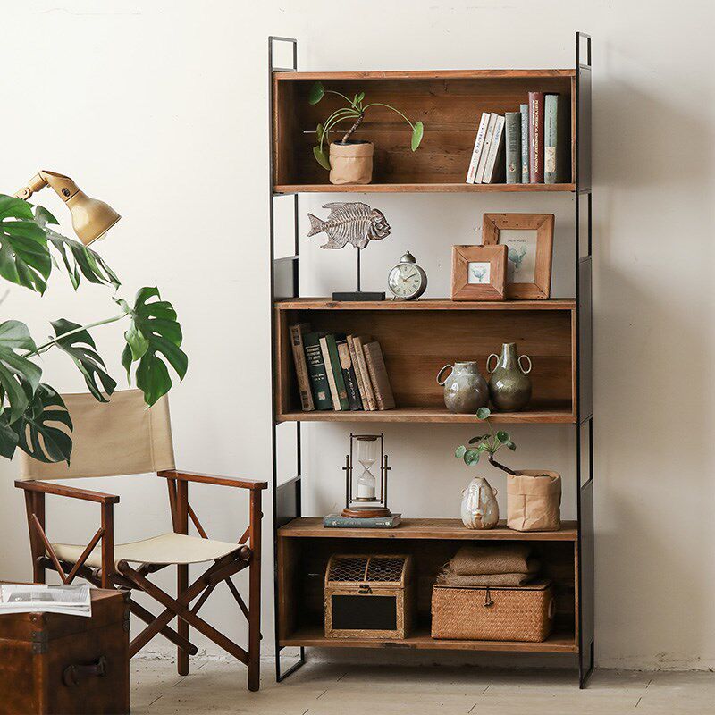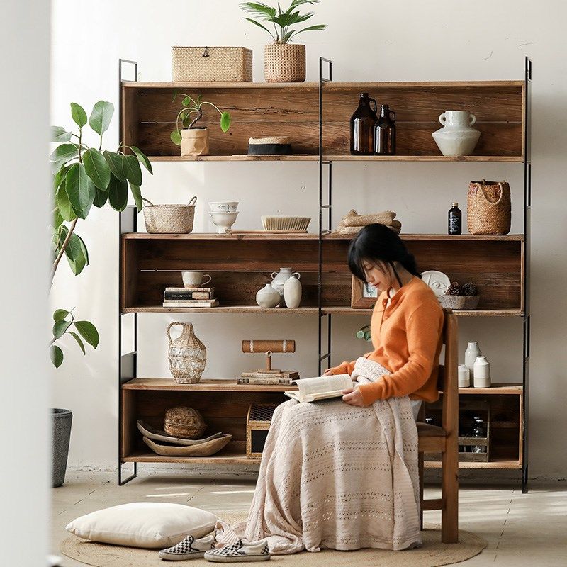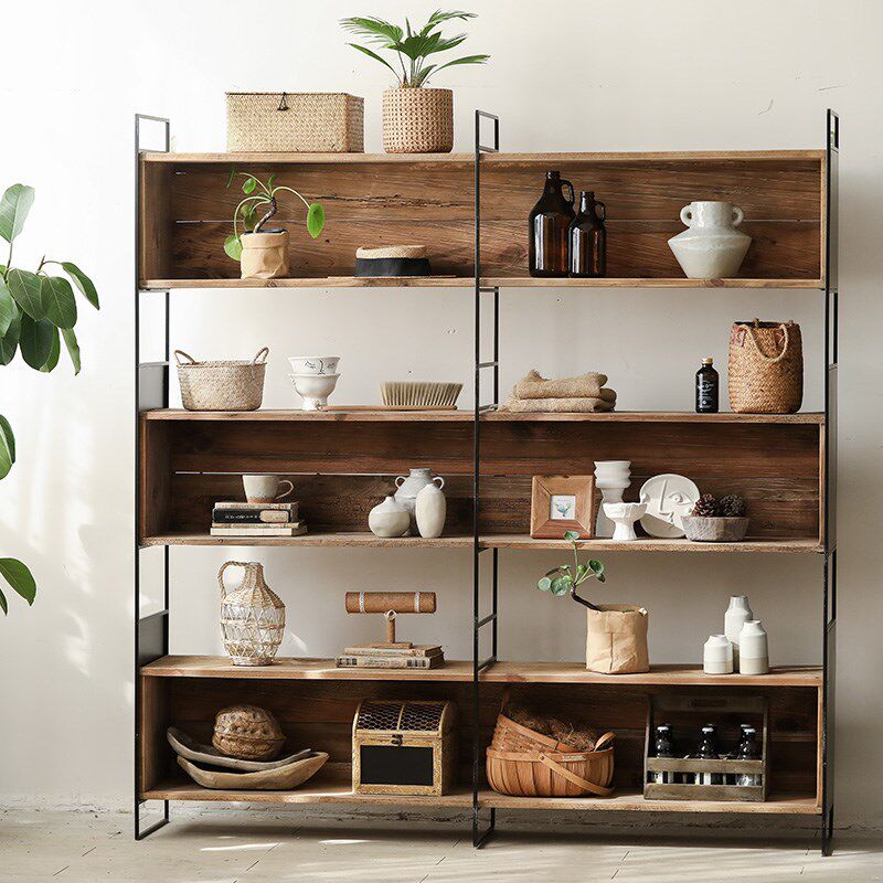 📚 老松木三格书柜侘寂风大型铁艺实木置物柜复古原木落地靠墙书架