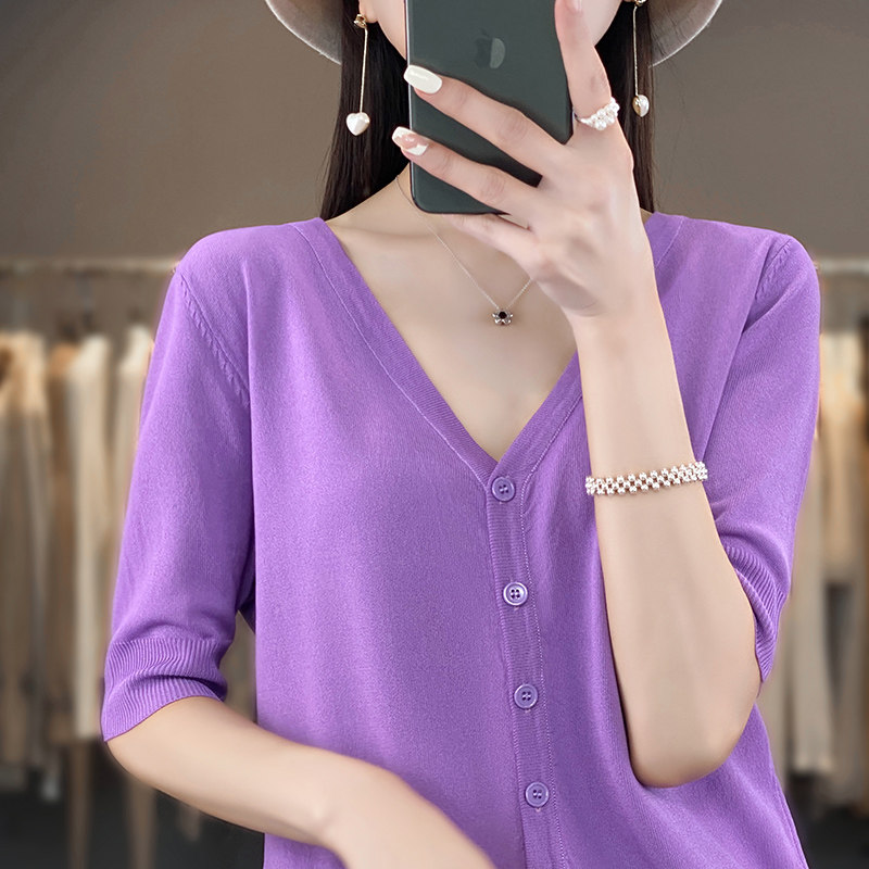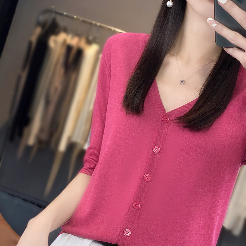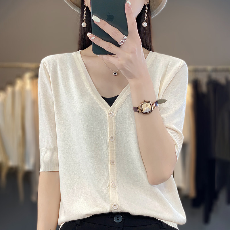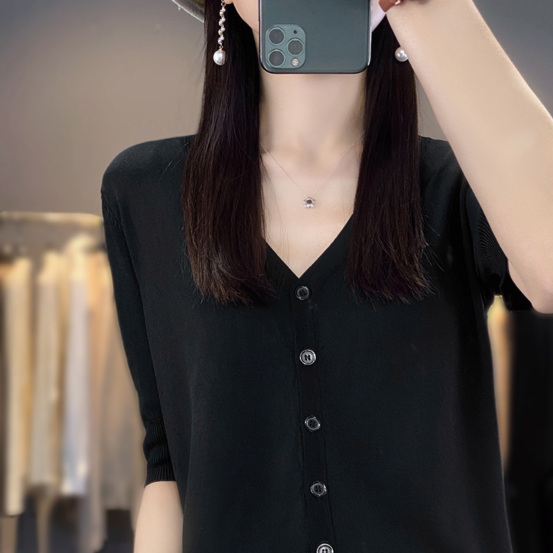 📚 冰丝针织短袖开衫女薄款外搭夏季短款小个子外穿百搭休闲v领半袖