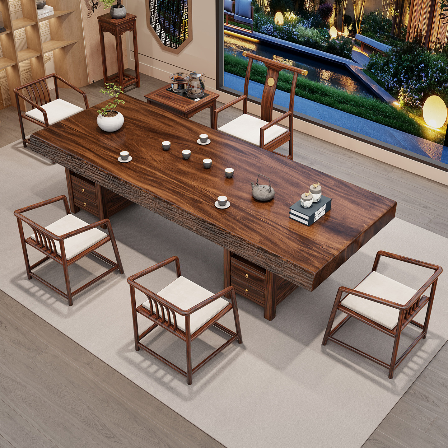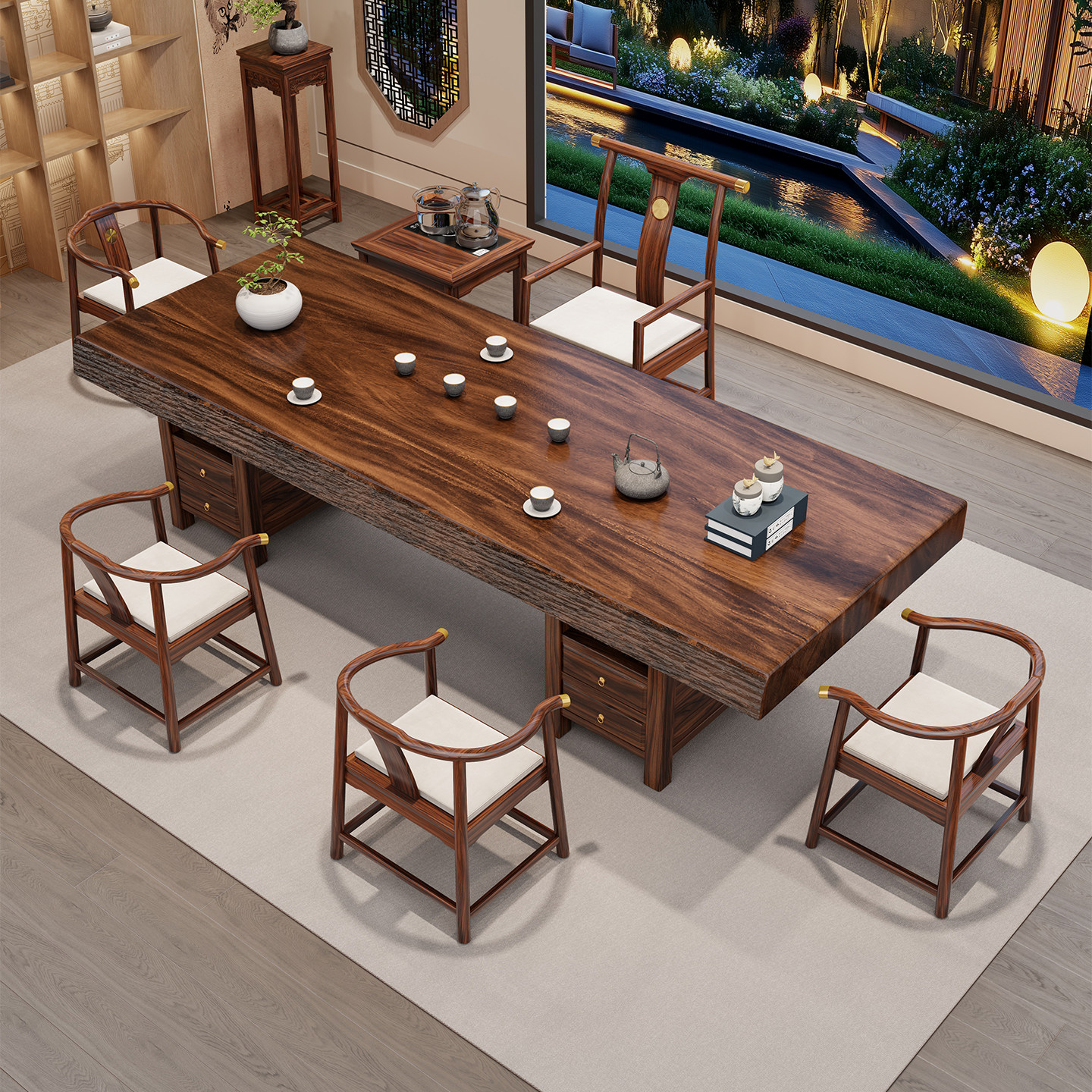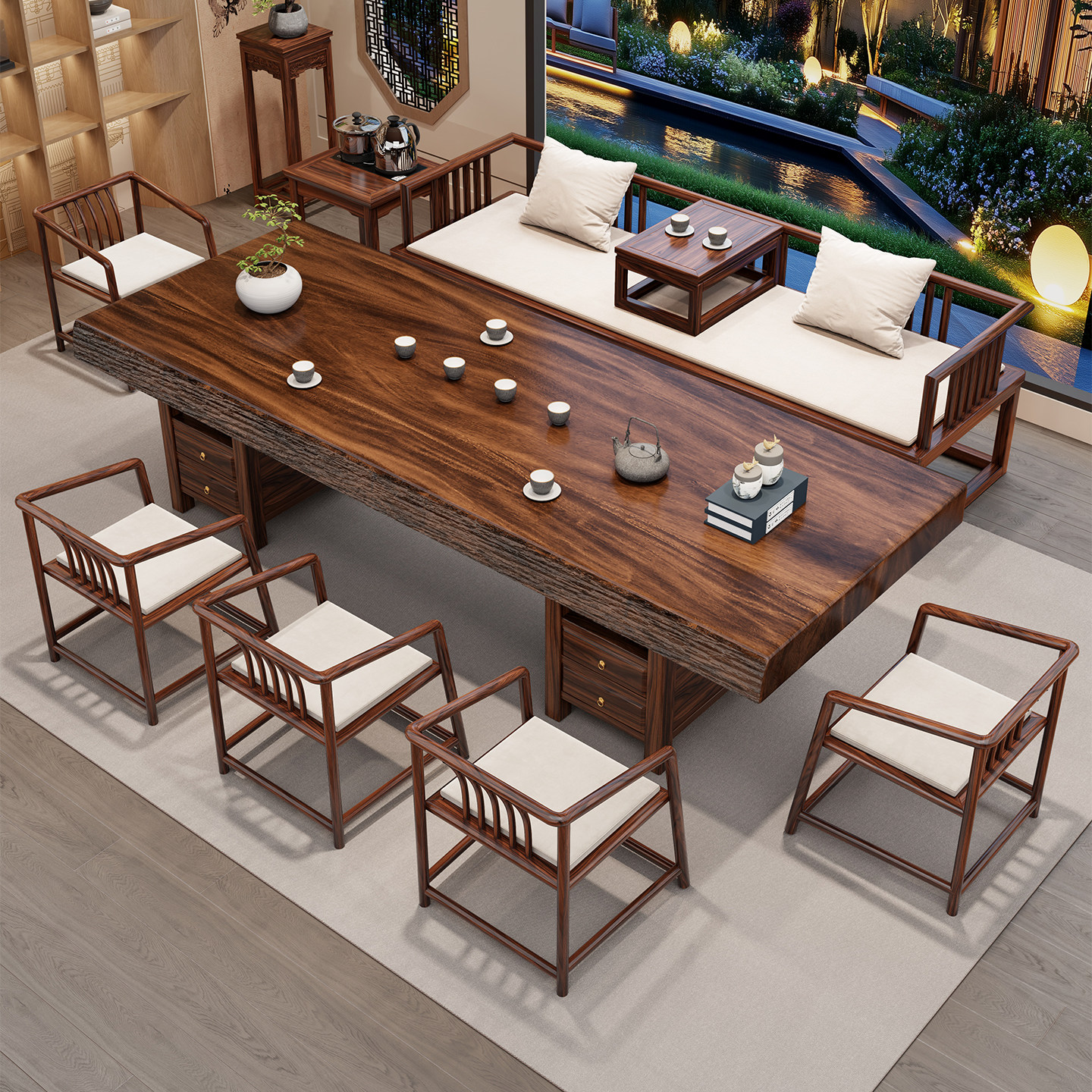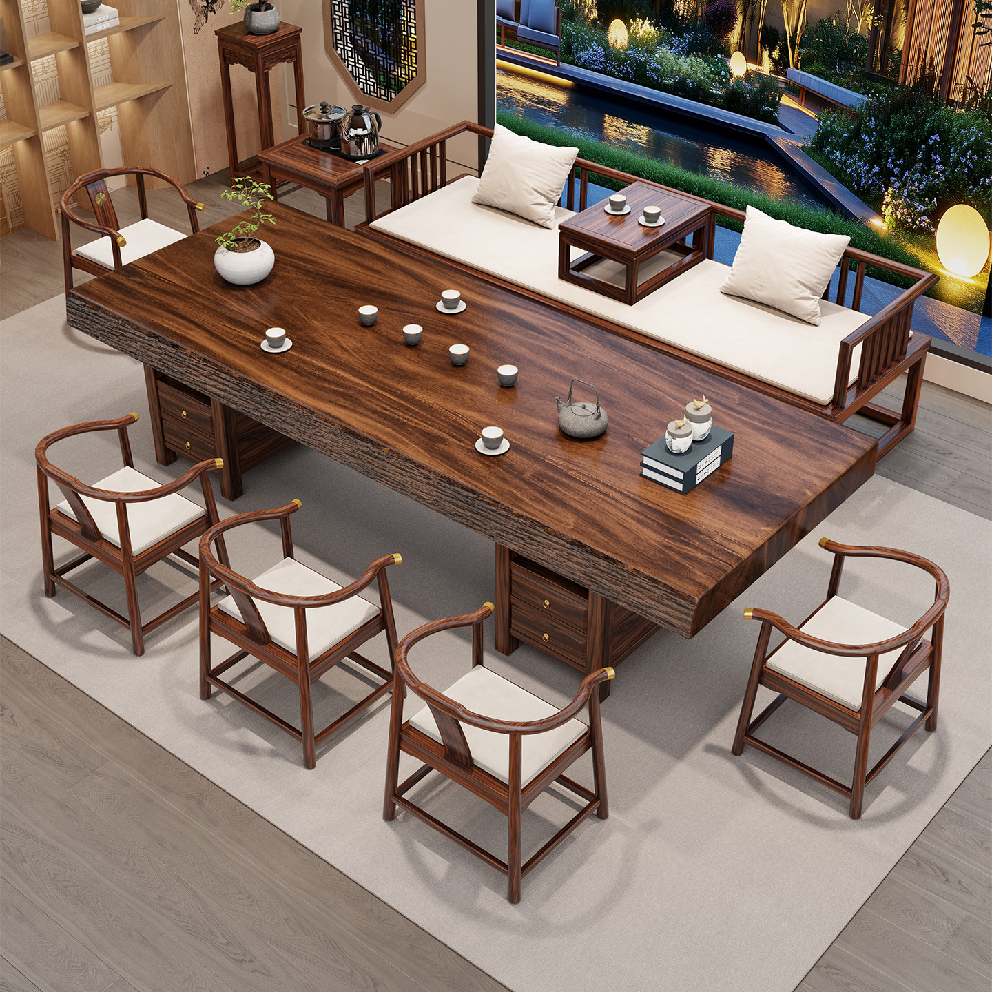 📚 乌金木实木大板茶桌椅罗汉床组合2026新款高端办公室茶台家用茶几